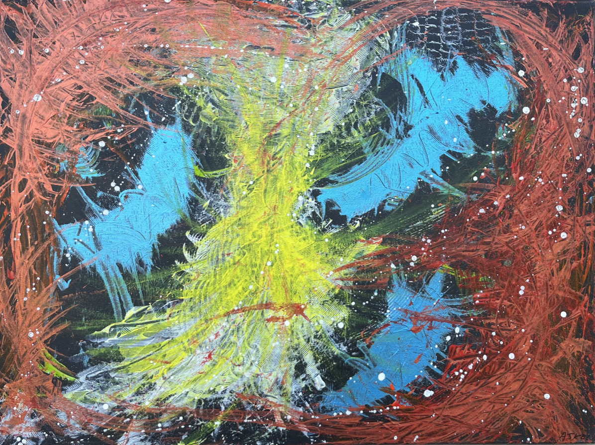 Marie Ange AJKEL HERGAUX, "Peinture abstraite et intuitive", acrylique sur toile, appliquée grâce à divers médium (couteau, plume, peigne, doigts) signée en bas à droite, 60 x 80 cm.