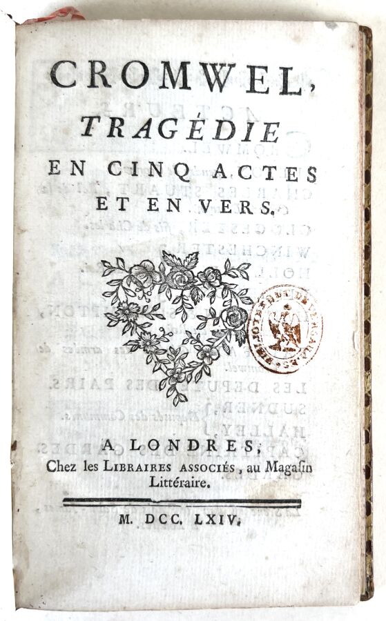 [MARIE-ANTOINETTE] - [MAILLET DU CLAIRON (Antoine)] - Cromwel, tragédie en cinq actes et en vers - Londres ; Les Libraires Associés, 1764 - 1 volume In-12° - Reliure de l'époque veau havane moucheté (fendillement partiel aux 2 mors, de menus frottements) - Triple filet d'encadrement et armes centrales de la reine Marie-Antoinette dorées aux plats - Dos lisse orné de fers dorés et du chiffre C. T. (pour château du Trianon) - Pièce de titre maroquin beige - Tranches mouchetées de brun - Précieux exemplaire relié aux armes de la reine, provenant de sa bibliothèque du Petit Trianon comme l'indique le chiffre couronné C.T. au dos et le cachet humide au titre - Les livres provenant de cette bibliothèque auraient été reliés par Ract.
