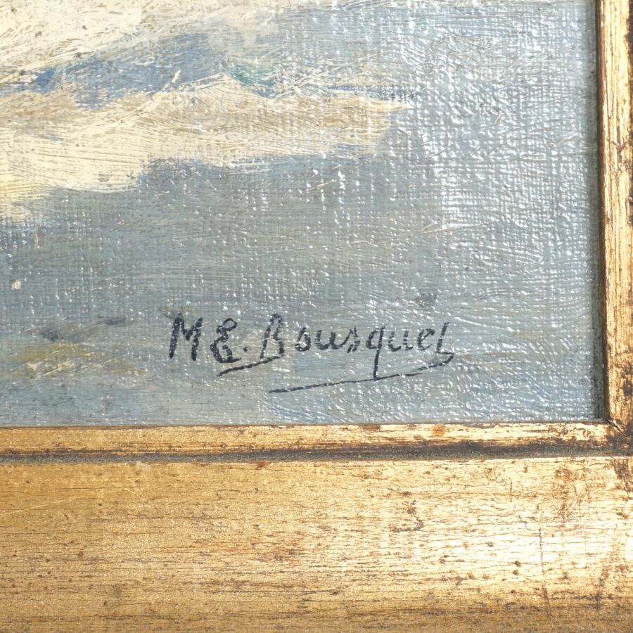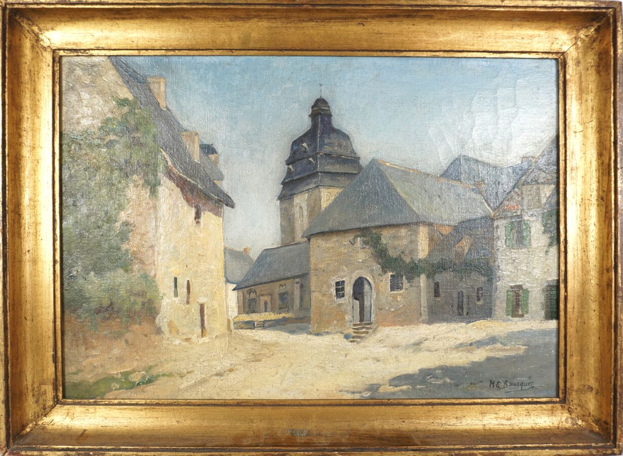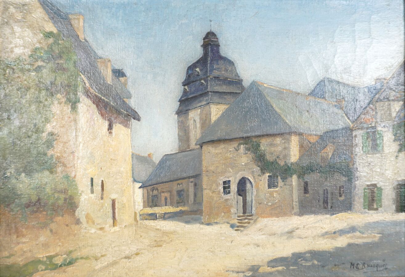 Marie Emmanuelle BOUSQUET (1876-1950) "Le Faouët, la rue de l'église", huile sur toile, signée en bas à droite, 38 x 54 cm.