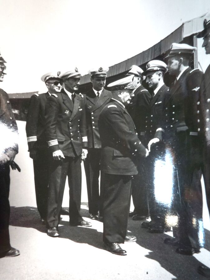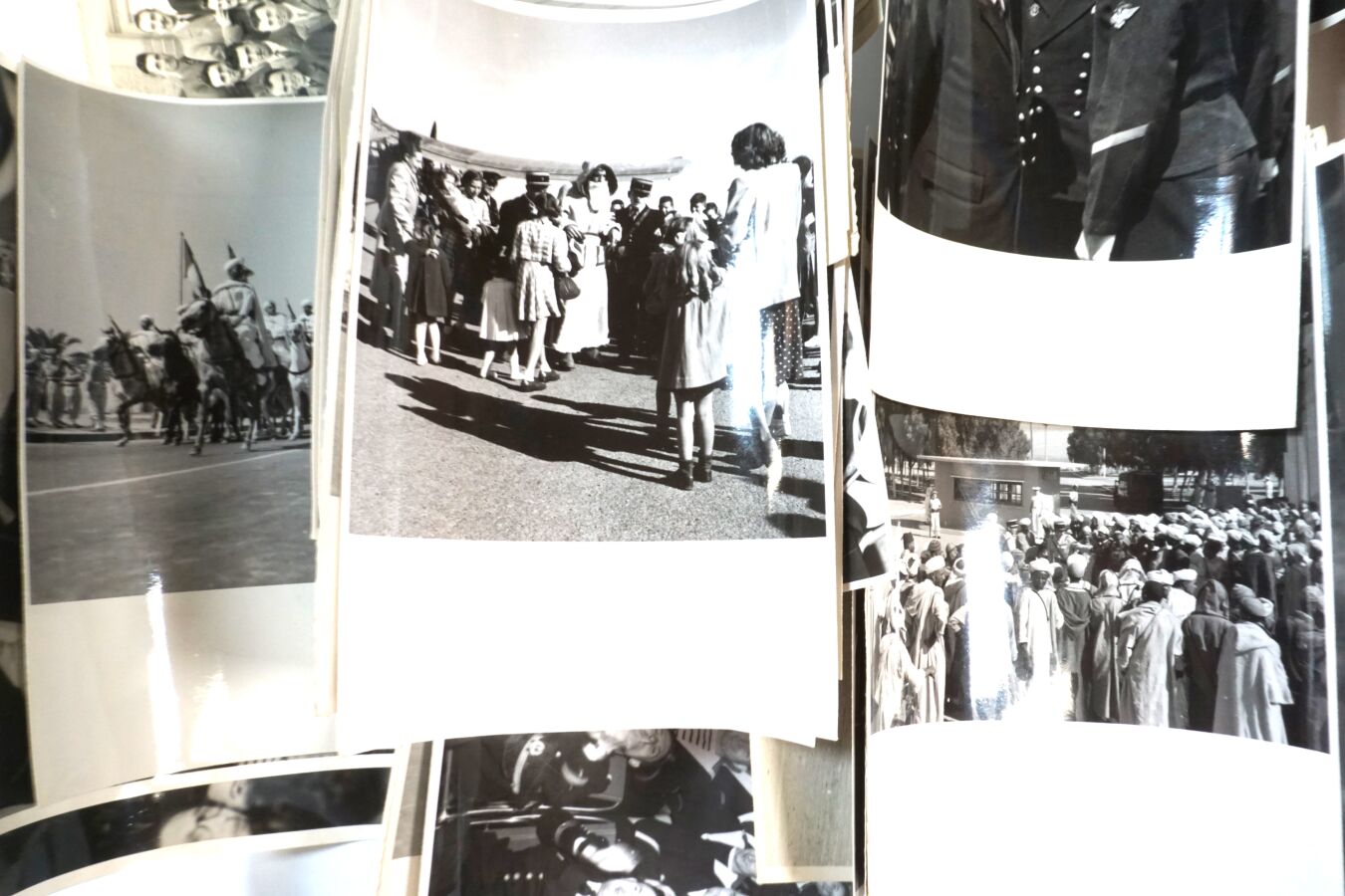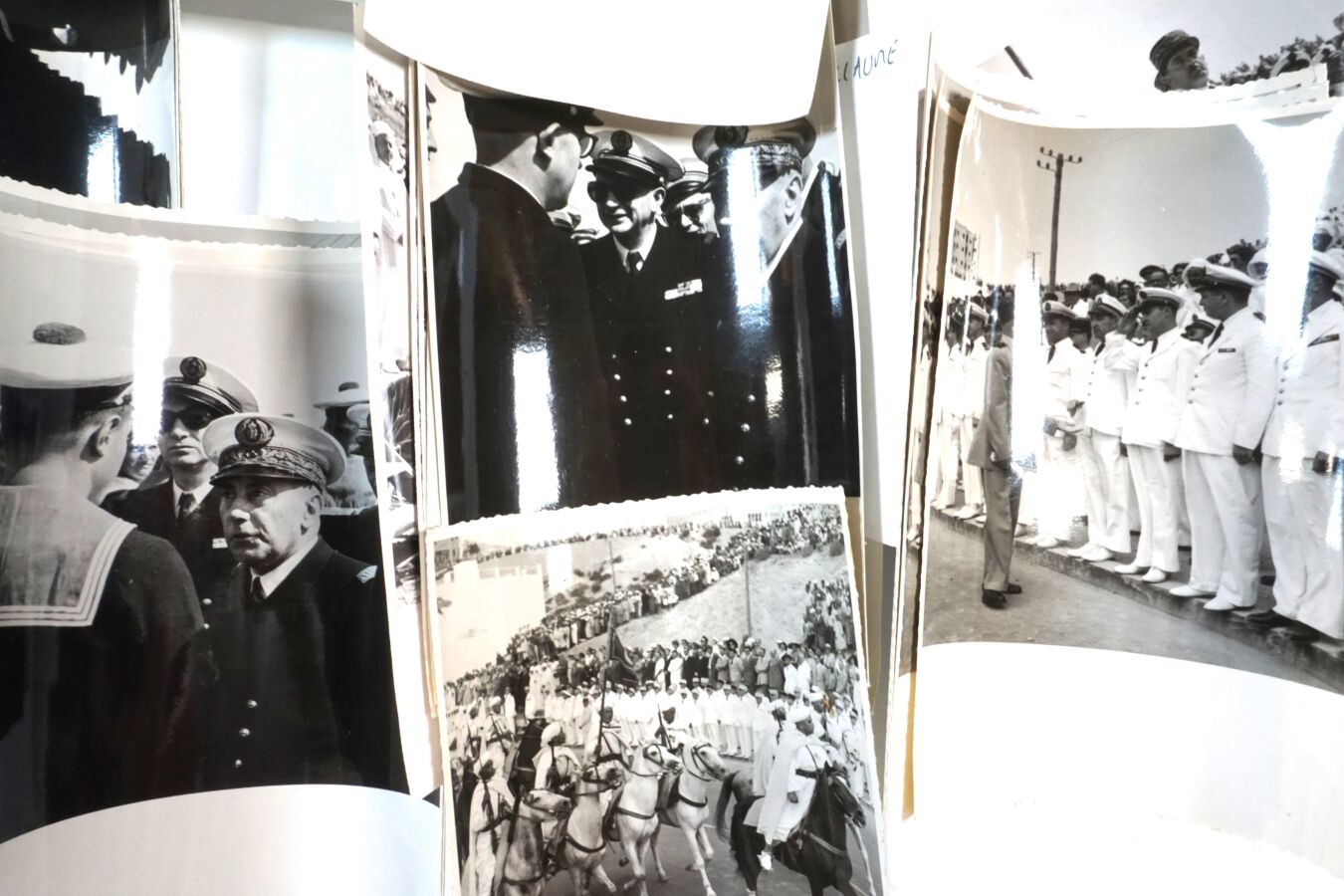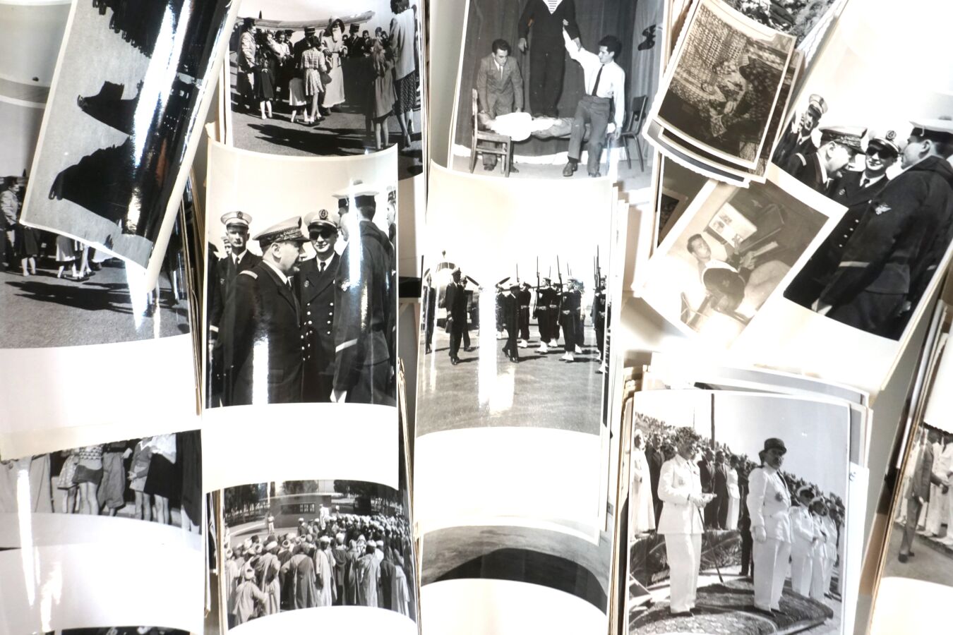 MARINE NATIONALE - BASE ECOLE D'AGADIR - Important ensemble de CLICHES PHOTOGRAPHIQUES noir et blanc dont DEFILES, ACCUEIL D'OFFICIER GENERAUX, BALS, VISITE DU MARECHAL JUIN…, années 1950, BE.