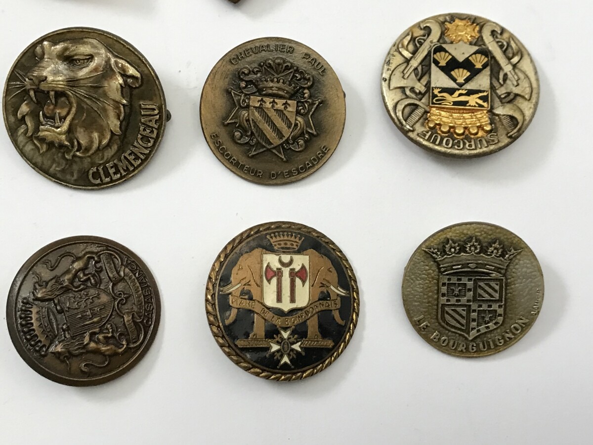 MARINE NATIONALE - Ensemble comprenant 12 INSIGNES DE BATIMENTS : OURAGAN (sans), FLOTTE GUEPRATTE (Arthus Bertrand Paris), PORTE-AVIONS FOCH (Arthus Bertrand Paris), ESCORTEUR D'ESCADRE CHEVALIER PAUL (Augis Lyon), CROISEUR DE GRASSE (Augis Lyon), ESCORTEUR D'ESCADRE CASABIANCA (Arthus Bertrand), ESCORTEUR MAHE DE LA BOURDOUNNAIS (Arthus Bertrand Paris), ESCORTEUR RAPIDE LE BOURGUIGNON (Augis Lyon), ESCORTEUR D'ESCADRE SURCOUF (Augis Lyon), PORTE-AVIONS CLEMENCEAU (Arthus Bertrand Paris), CROISEUR ECOLE JEANNE-D'ARC (Courtois Paris) et ECOLE NAVALE (Arthus Bertrand Paris), la plupart de ces insignes ont été vernis et un nettoyage à l'acétone leur redonnera leur aspect d'origine, BE.