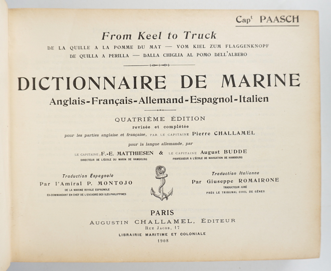 [MARINE] - PAASCH (Capitaine) - De la quille à la pomme du mât. Dictionnaire de marine Anglais-Français-Allemand-Espagnol-Italien [] - Paris ; Augustin Challamel, 1908 - 1 fort volume In-4° oblong - Texte sur 5 colonnes - Reliure éditeur demi-chagrin havane (coins usés, charnières fendues, parties de coupes usés) - Dos à faux nerfs ornés de filets à froid titré or (décollé et coiffe inférieure très frottée) - Ex-libris manuscrits : H. Cangardel.
