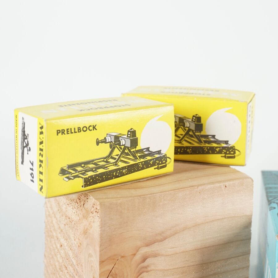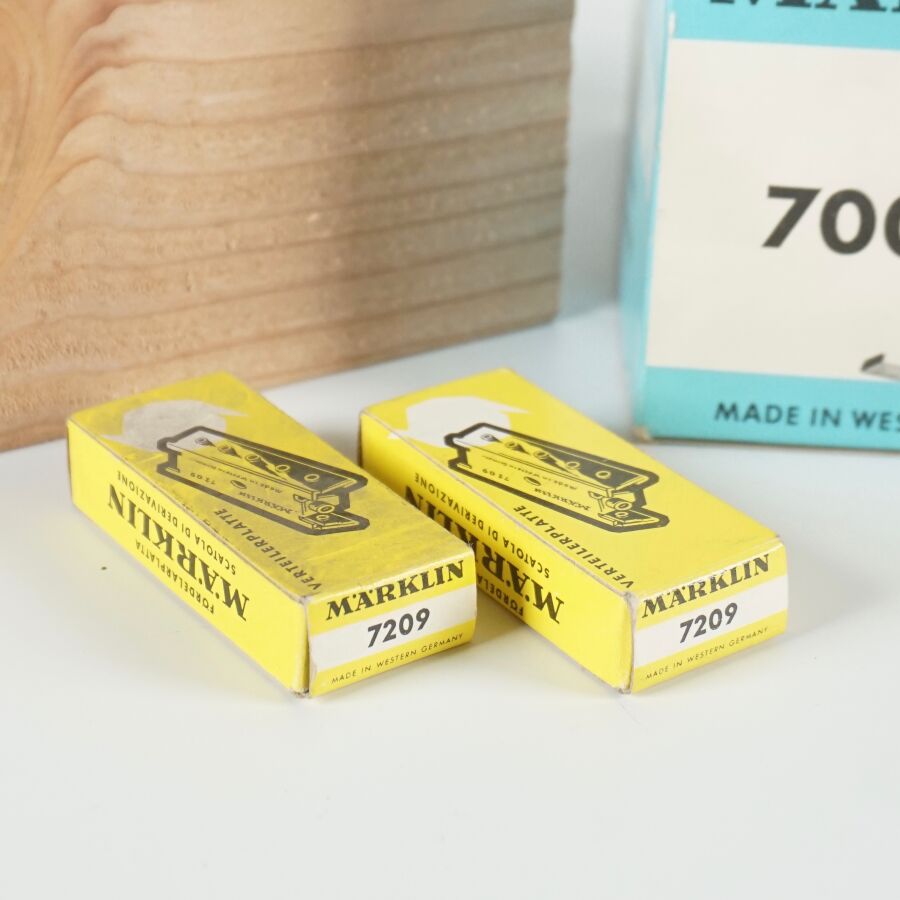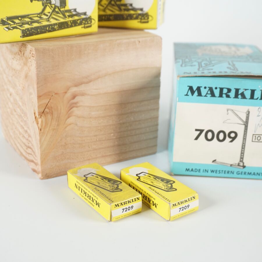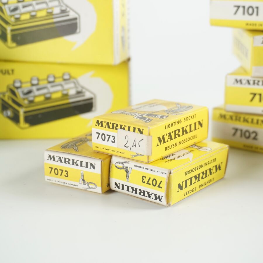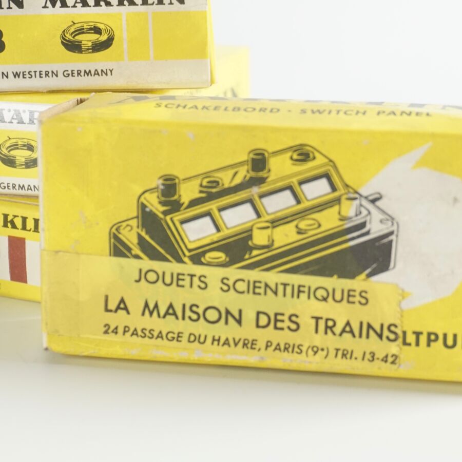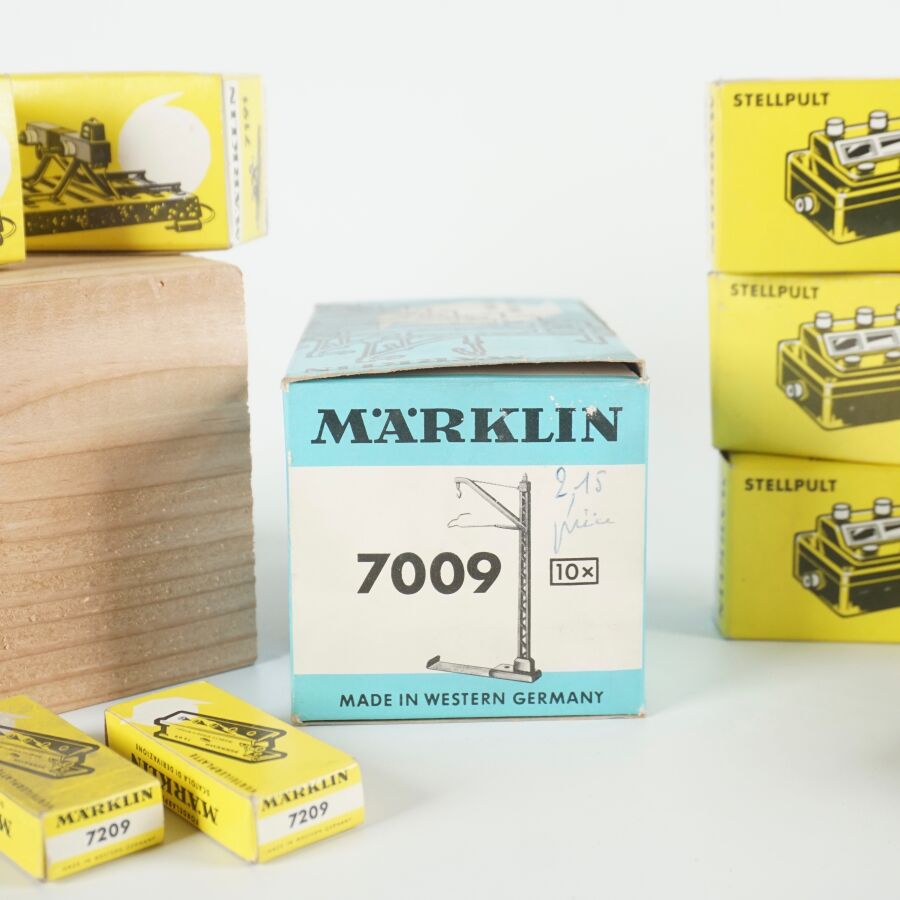 MARKLIN : Ensemble d'accessoires divers, comprenant (4) câbles dont rouge, marron, bleu et jaune, réf. 7105 ; (1) tableau de commande, réf. 7210 ; (2) boîtes dérivation, réf. 7209 ; (3) socles d'éclairage, réf. 7073 ; (2) heurtoirs, réf. 7191, (1) poteau standard, réf. 7009 et (3) tableaux de commande, réf. 7072, dans leurs boîtes d'origine (usures aux boîtes, petites usures).
