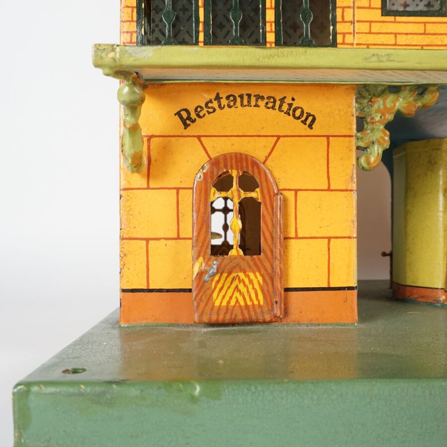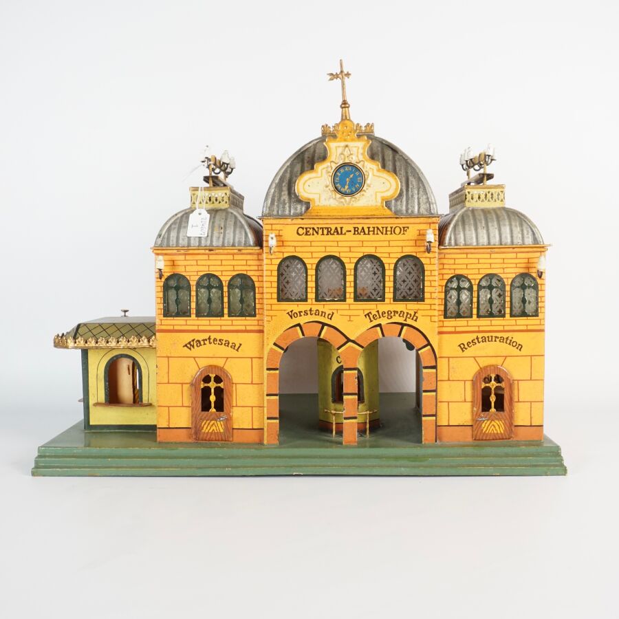 MARKLIN : Gare "Central - Bahnhof", tôle peinte, deux arches principales avec un personnage de réception, trois portes latérales avec borne lithographiée et système de cloche sonore, tampon rouge dessous, H. 38 cm. L. 46.4 cm. Larg. 24 cm (quelques possibles repeints, légères usures et écaillures, petites traces).