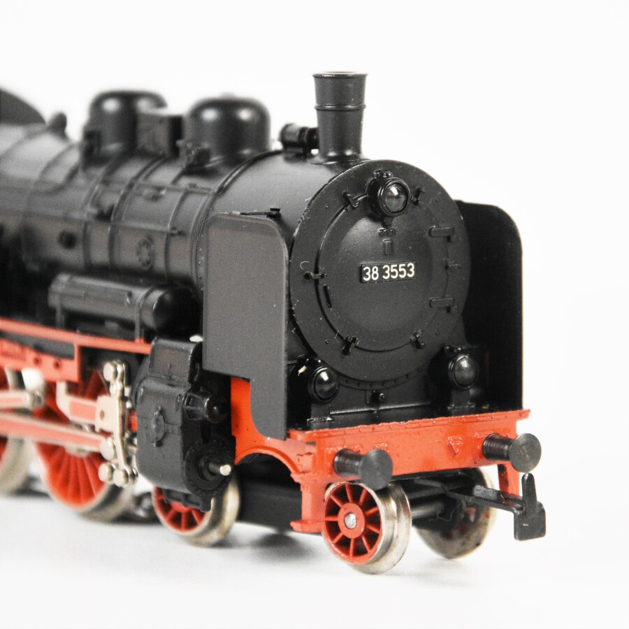 MARKLIN HO : Locomotive à vapeur allemande, réf. 3099, noire et rouge, et son tender, dans sa boîte d'origine, L. 23 cm.