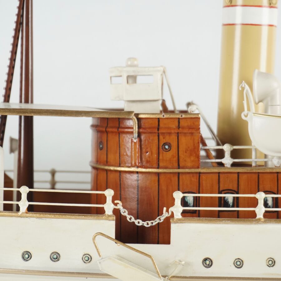MÄRKLIN - "Jolanda", réf 16064, bateau mécanique, tôle laquée polychrome, accompagné de ses divers accessoires dont notamment une ancre relevable, d'un gouvernail manoeuvrable, les échelles d'accès latérales ainsi que les canots sont mobiles, avec son ber à roulette en tôle laquée, L. 80 cm. H. Avec ber : 40 cm (sans boîte) (quelques usures et traces, possibles restaurations, repeints).