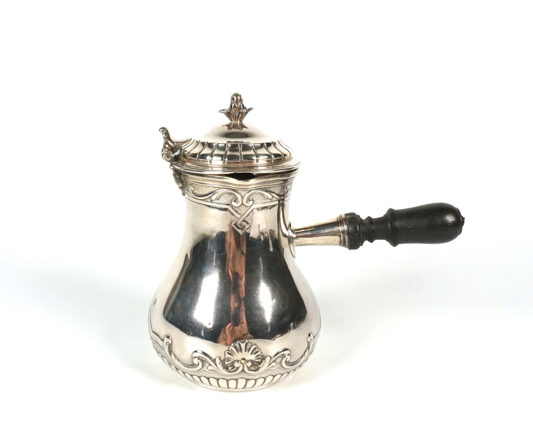 Martial GAUTHIER (1888-1902) Jolie verseuse égoïste en argent, poinçon Minerve 1er titre, à décor de godrons, frises géométriques et coquilles, le fretel formant un bourgeon, l'anse en bois noirci, H. 14.5 cm. Poids brut : 285 g environ.
