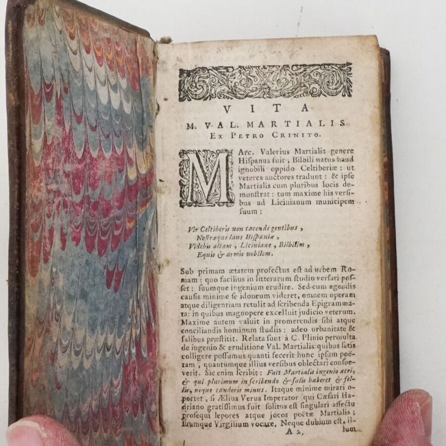 MARTIAL. OEuvres. s. l., s. n., s. d.. In-16, veau brun, dos à nerfs, reliure à semis de fleurs de lys.