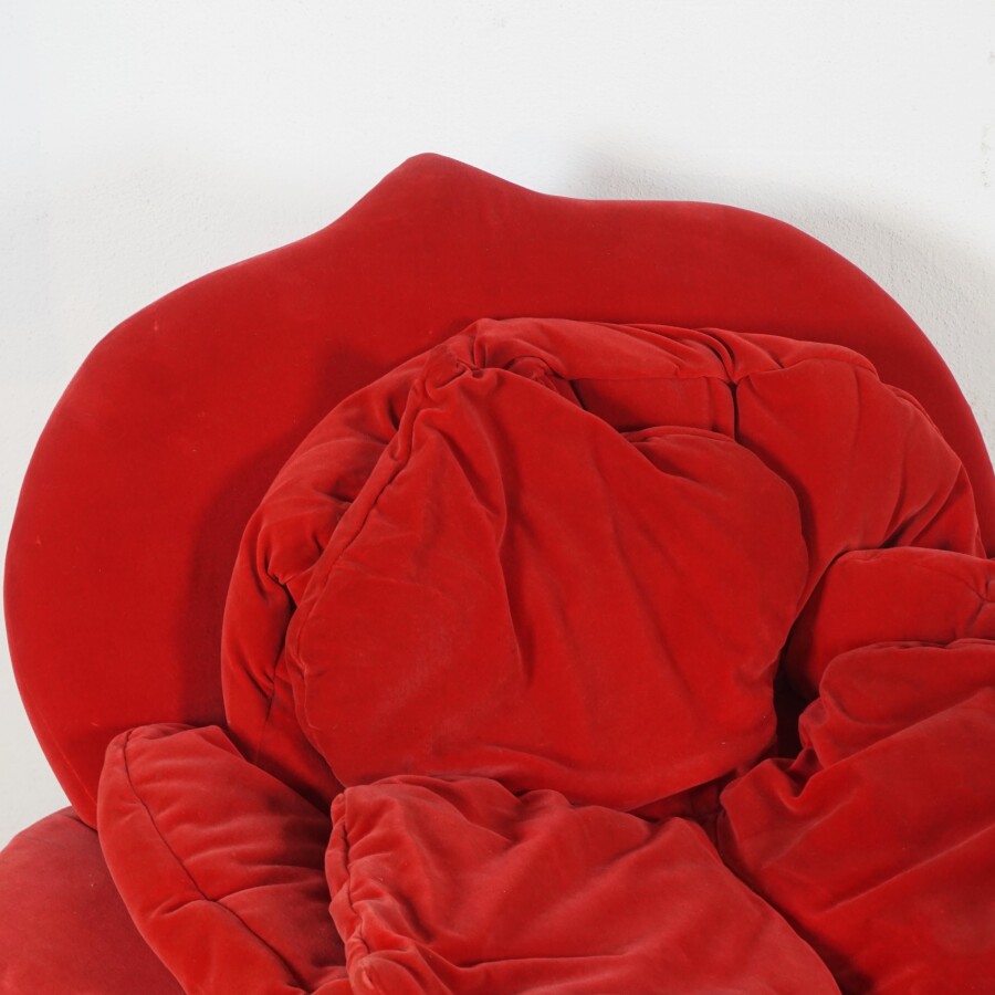 Masanori UMEDA (né en 1941) - EDRA (éditeur) : Fauteuil modèle "Rose", garniture de velours rouge, à coussins pétiolés, reposant sur trois pieds coniques en fonte d'aluminium, étiquette d'édition en-dessous, 77 x 85 x 80 cm (traces, velours taché, quelques usures).