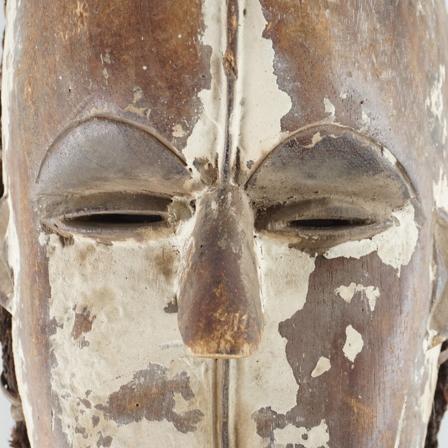 Masque, bois partiellement peint en blanc et tressage, travail décoratif moderne, Afrique, H. 42 cm.