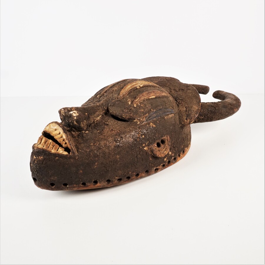 Masque en bois figurant un visage anthropomorphe surmonté d'une coiffure à deux cornes, style Urhobo, Nigéria, H. 50 cm.