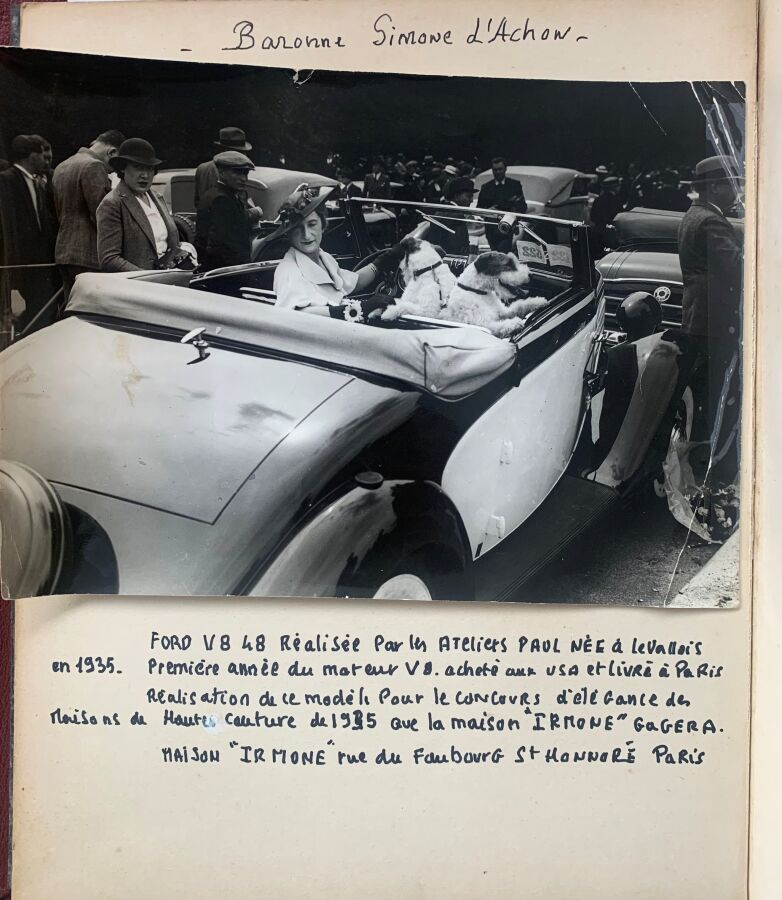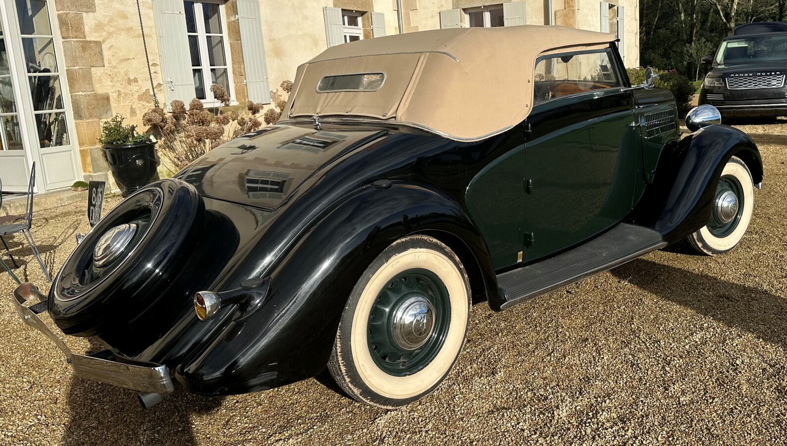 MATFORD type V848 du 01/01/1935, Cabriolet Spider par le carrossier Paul Née de Levallois-Perret. Carte grise française de collection n° de série : 1807. Automobile de 1ere main familiale avec historique, entièrement restaurée à tous niveaux de 1991 à 1996 : Carrosserie, Sellerie, Moteur, suspension etc… Factures et photos à disposition. Peinture de couleur verte et noire, capote de toile beige, nombreux chromes : Calandre, pare-chocs et phares Marchal. Sellerie et panneaux de portes cuir vert, 2 sièges avant, 1 banquette dans le spider + 1 siège enfant, moquettes anciennes, tableau de bord loupe d'orme ainsi que les hauts de portes. Moteur V8, 3621cm3, carburateur Edelbrock, allumage Delco + bobine, ajout d'une pompe à essence électrique et d'un réservoir d'huile additionnel. Pneus flancs blancs sur jantes artilleries avec enjoliveurs chromés, roue de secours à l'arrière. Automobile ayant participé dans les années 30 à plusieurs concours d'élégance.