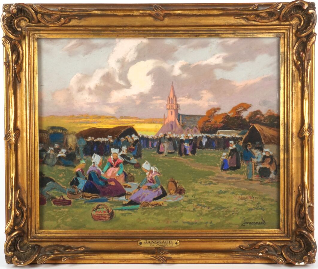 Mathurin JANSSAUD (1857-1940), "Pardon à Sainte-Anne La Palud", pastel sur papier signé en bas à droite, 32 x 39 cm (à vue).