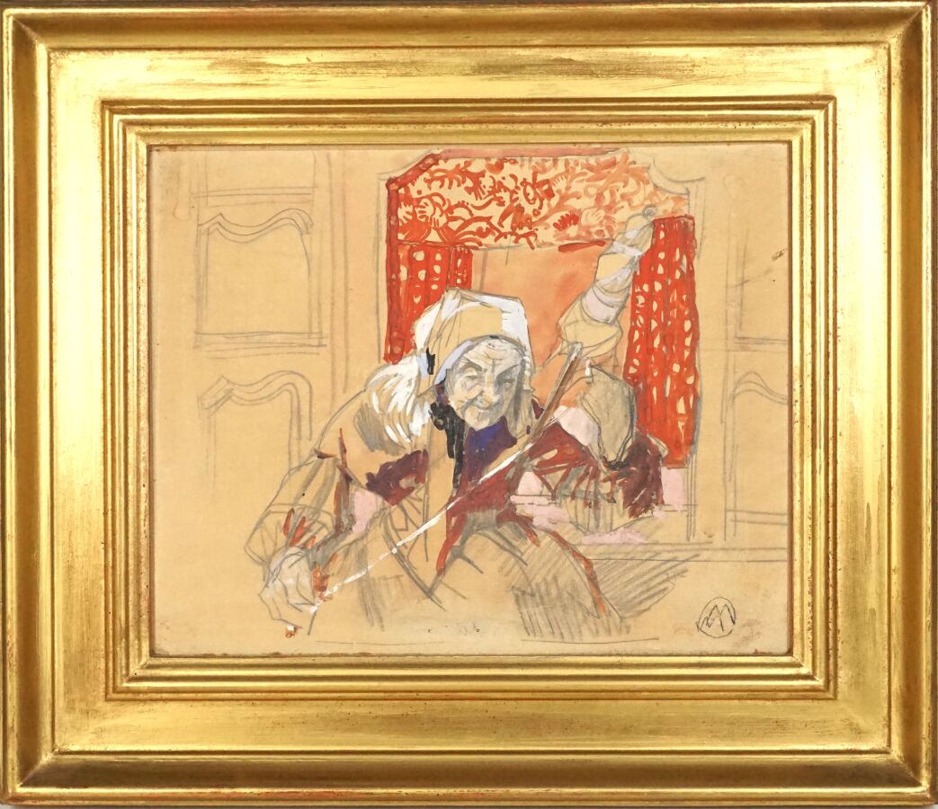 Mathurin MÉHEUT (1882-1958), "Bretonne à la quenouille", dessin, aquarelle et rehauts de gouache blanche, signée du monogramme de l'artiste en bas à droite, 26,5 x 33 cm (à vue).