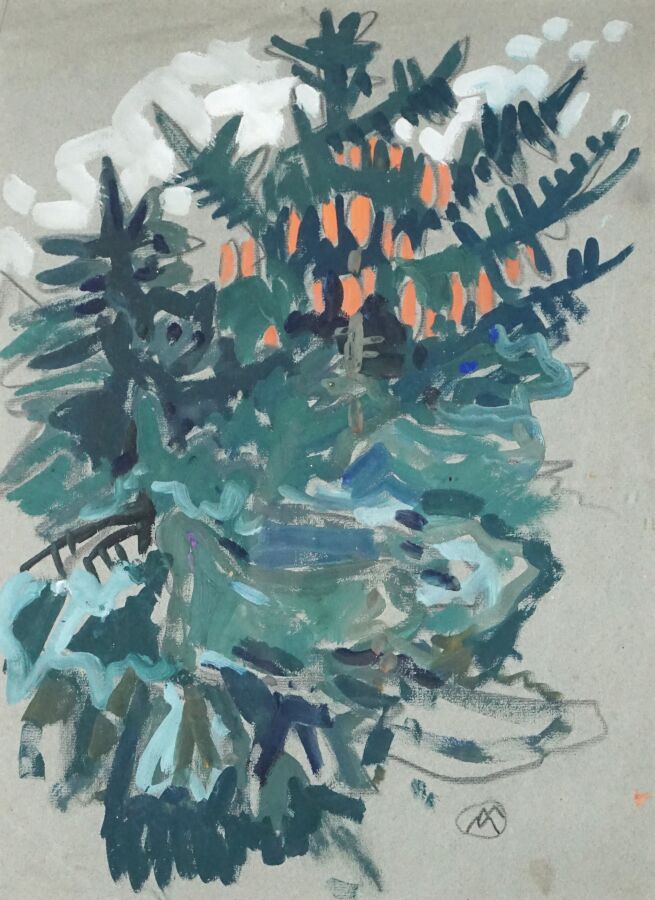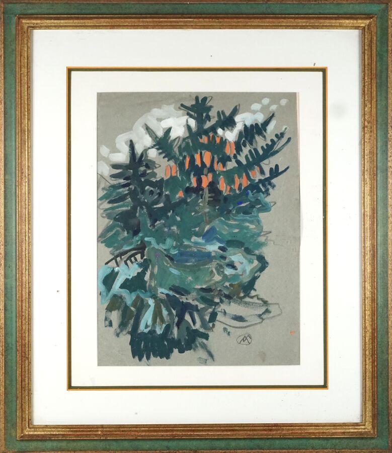Mathurin MÉHEUT (1882-1958), "Composition végétale", gouache et fusain sur papier gris, signé du monogramme de l'artiste en bas à droite, 41.5 x 31 cm (à vue) (petites traces).