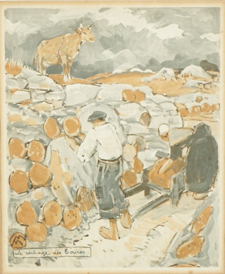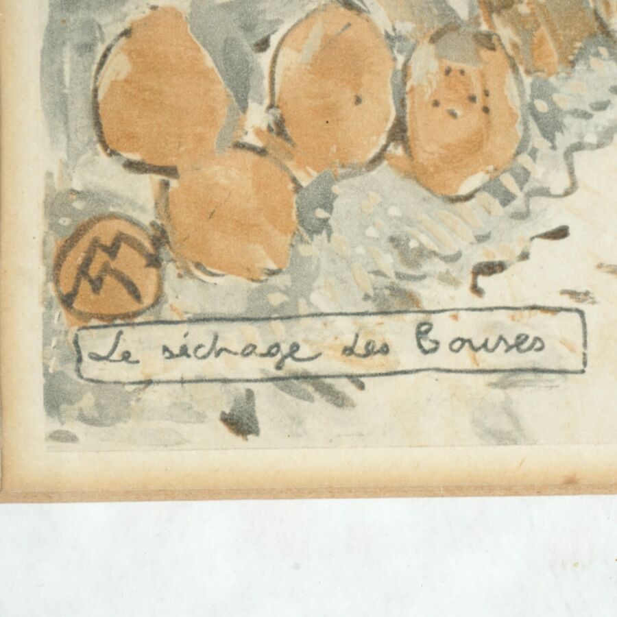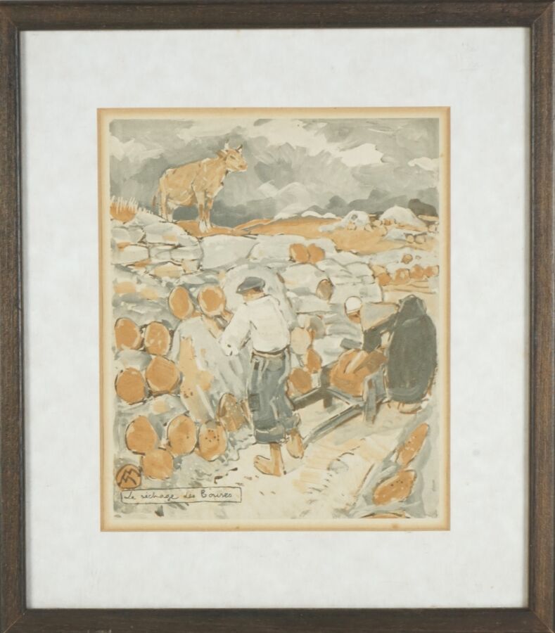 Mathurin MÉHEUT (1882-1958), "Le séchage des bouses", lithographie en couleur, monogrammée et titrée dans la planche en bas à gauche, Dim. 20 x 16 cm (à vue).