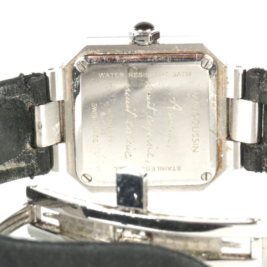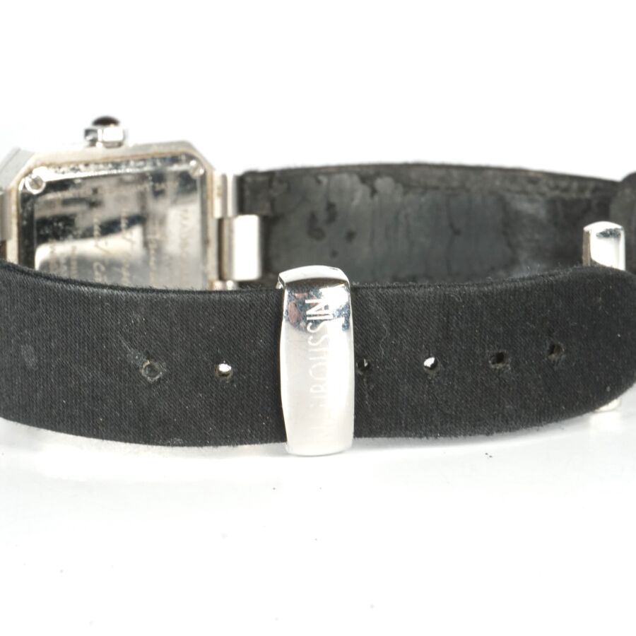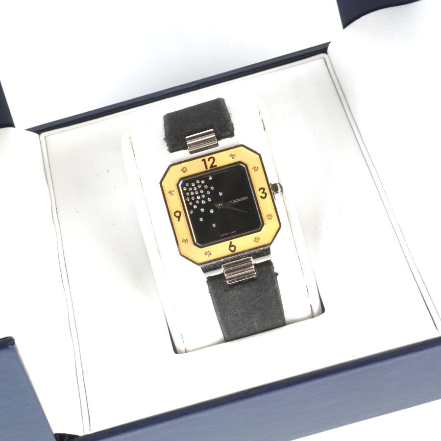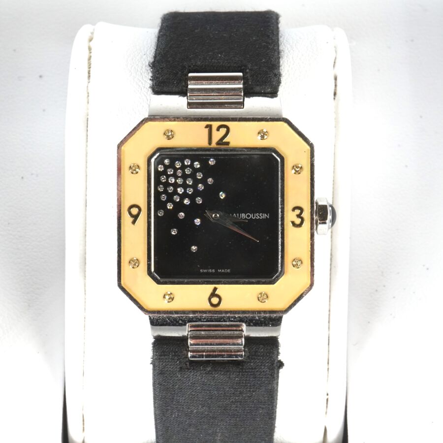 MAUBOUSSIN : "Amour, nuit coquine, nuit calme", montre bracelet, boîtier en acier chromé de forme carrée à pans coupés, cadran à fond noir signé, parsemé de petits diamants, lunette externe nacrée dans les tons jaunes alternant chiffres arabes et diamants, couronne sertie d'un cabochon de pierre noire, bracelet satiné noir, boucle déployante, mouvement à quartz, numérotée et titrée au dos, présentée dans son écrin d'origine, Dim. Boîtier : 2.7 x 2.7 cm (bracelet en l'état, petites rayures d'usure).