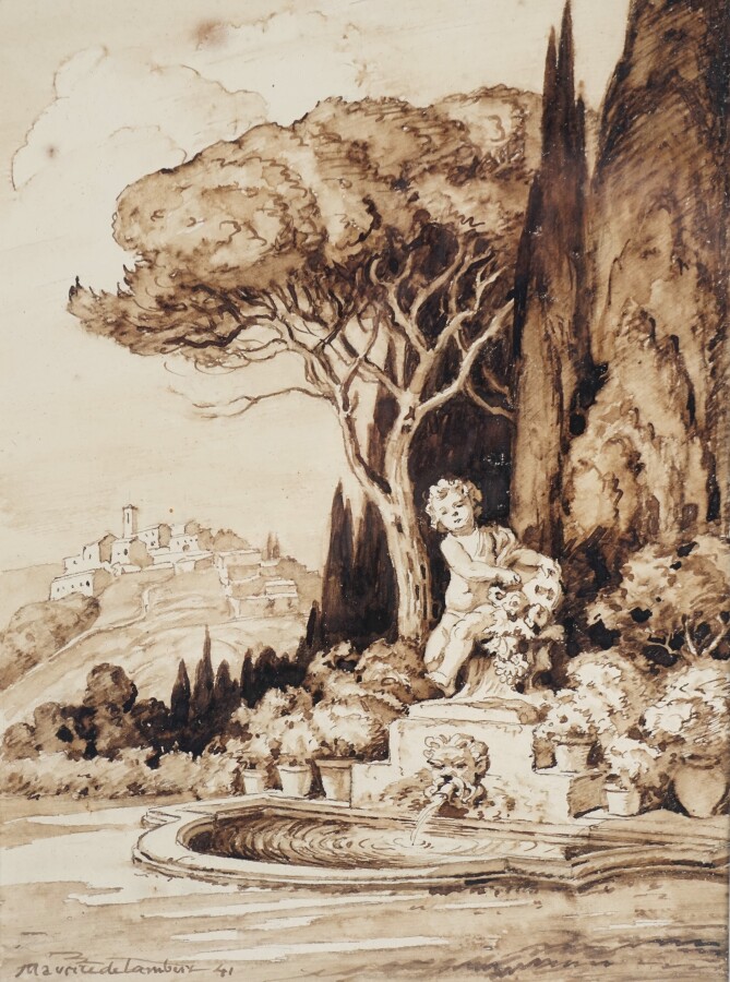 Maurice DE LAMBERT (1873-1952), "La fontaine, paysage du sud de l'Italie" 41, dessin à l'encre et lavis sur papier, signé et daté en bas à gauche, 25 x 18.5 cm (quelques taches).