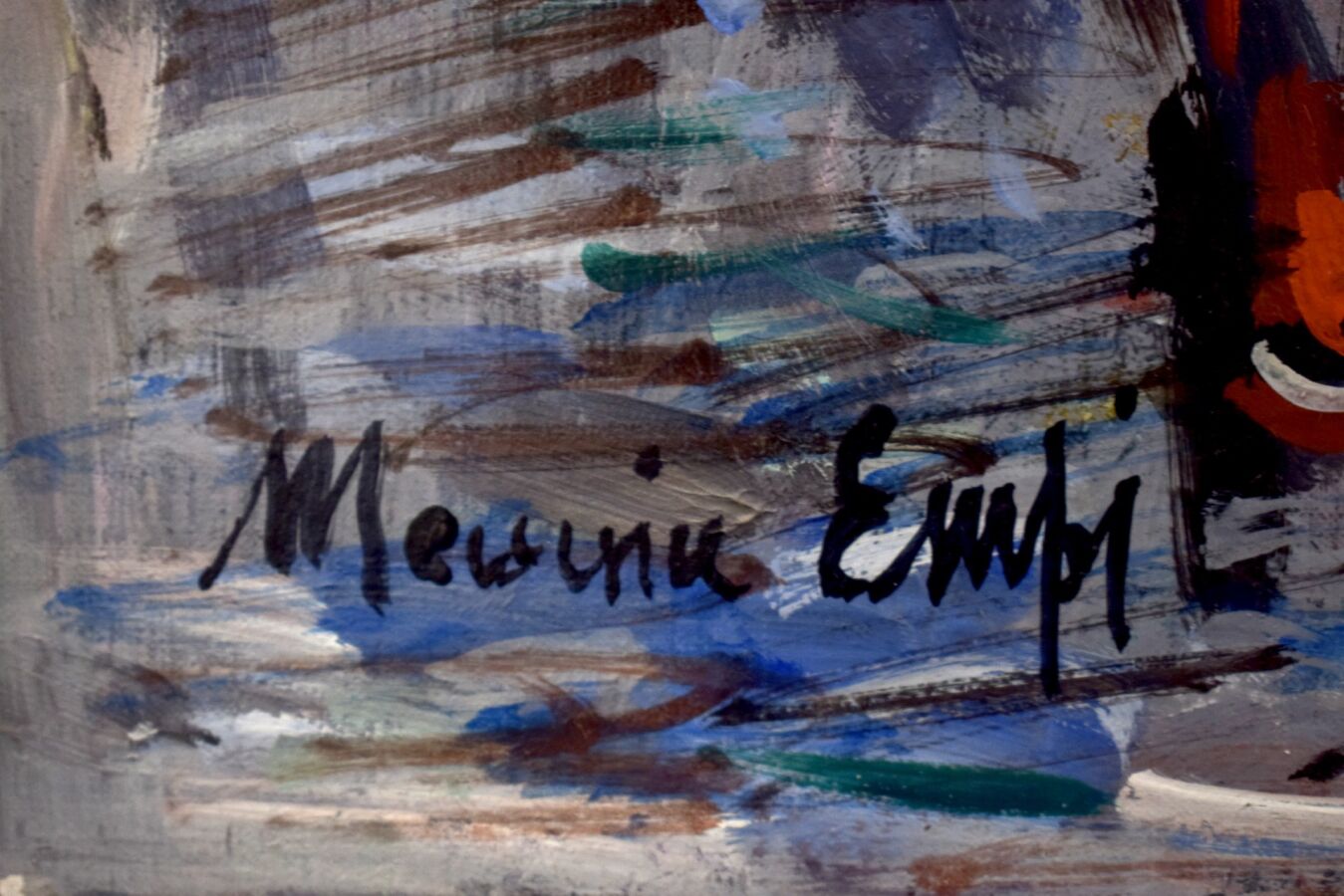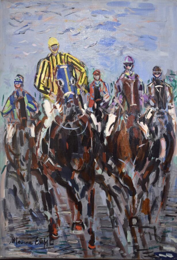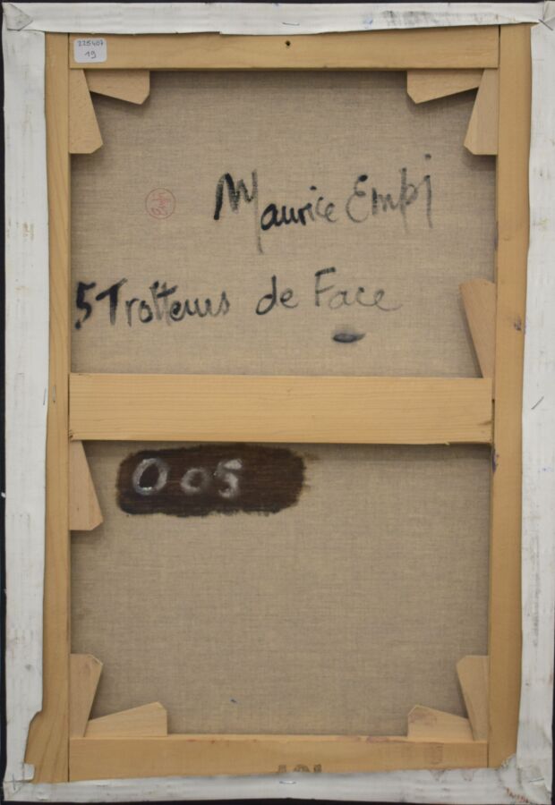 Maurice EMPI (1933), "Cinq trotteurs de face", huile sur toile, signée en bas à gauche, contresignée et titrée au dos, 55 x 38 cm.