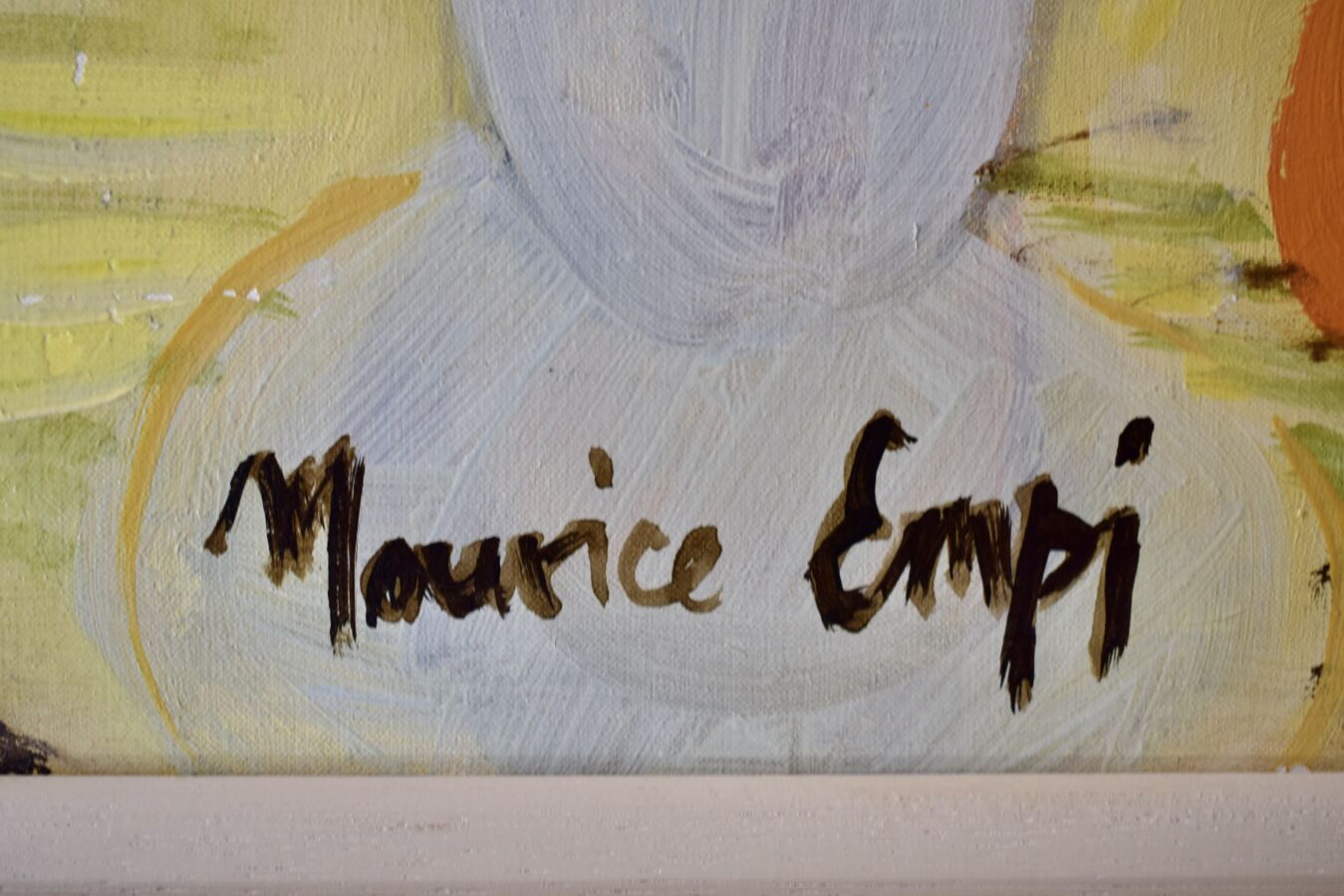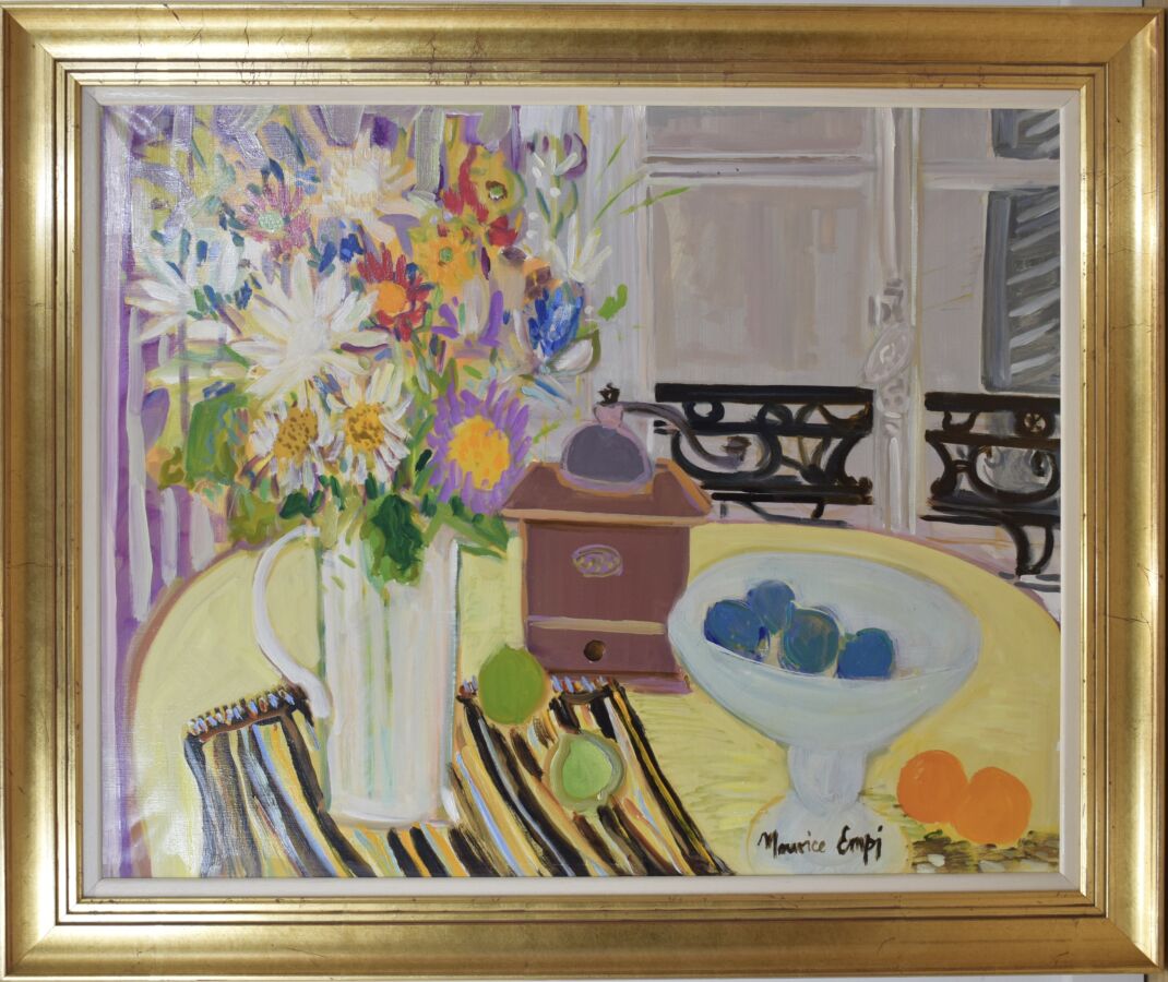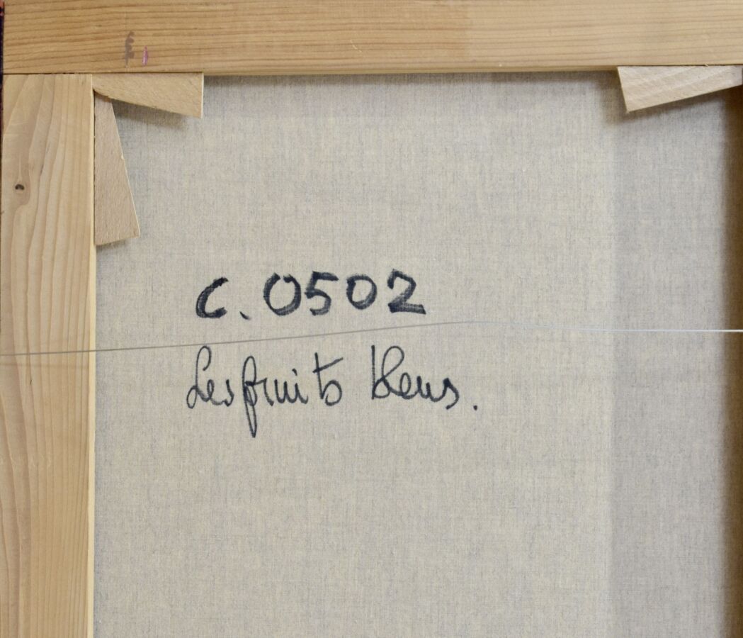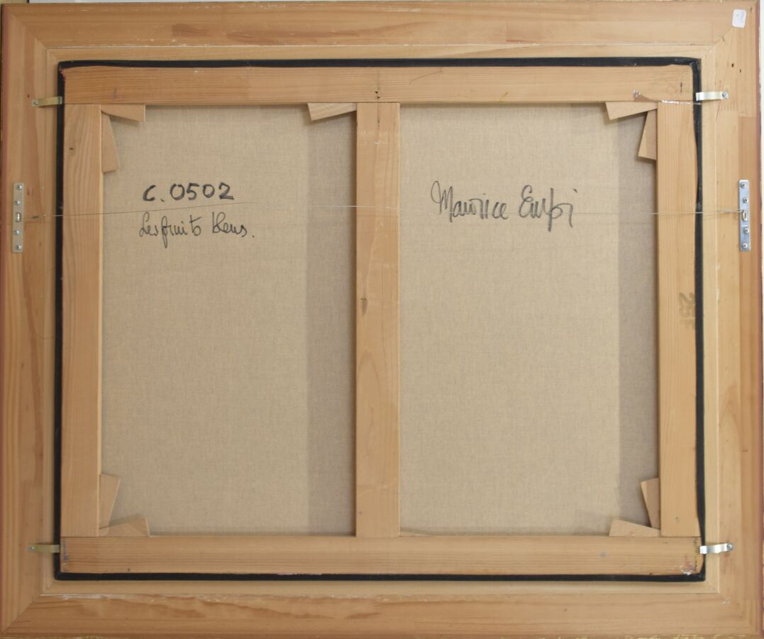 Maurice EMPI (1933), "Les fruits bleus", 1999, huile sur toile, signée au centre à droite, contresignée et titrée au dos, 81 x 65,4 cm.