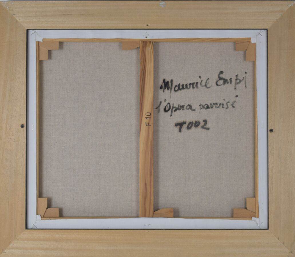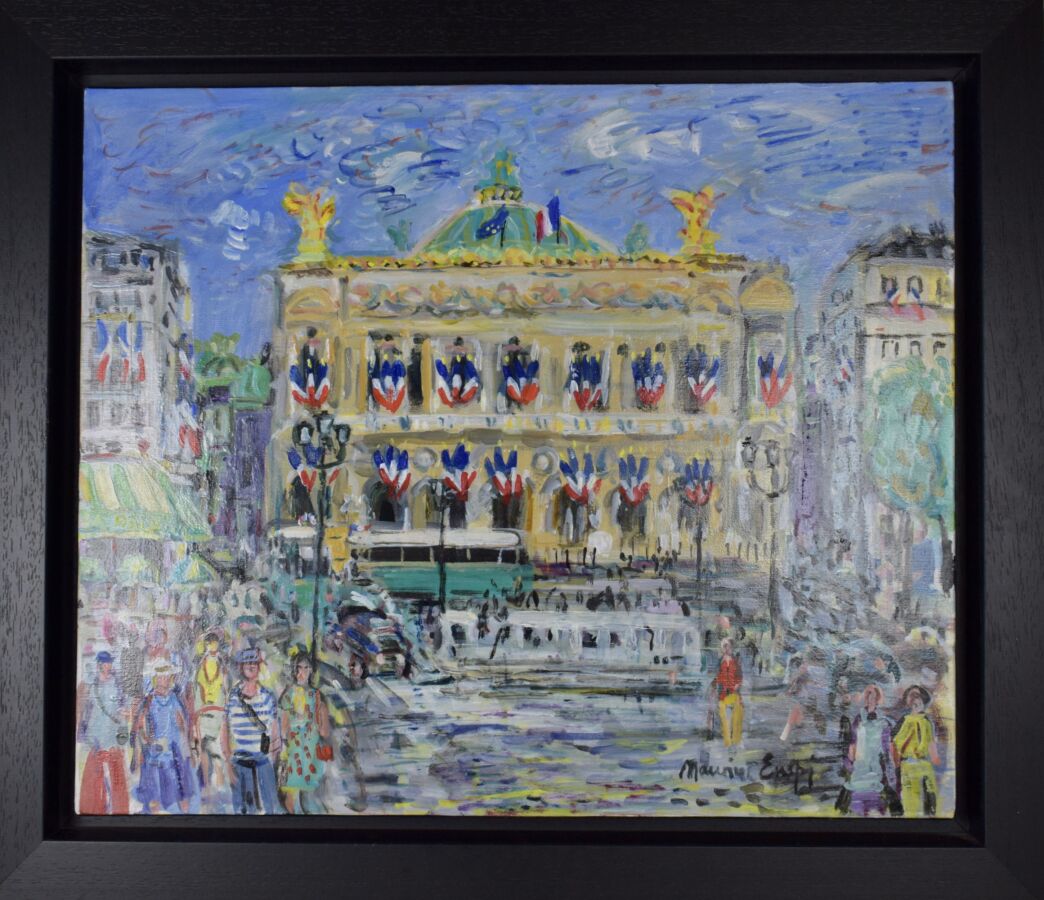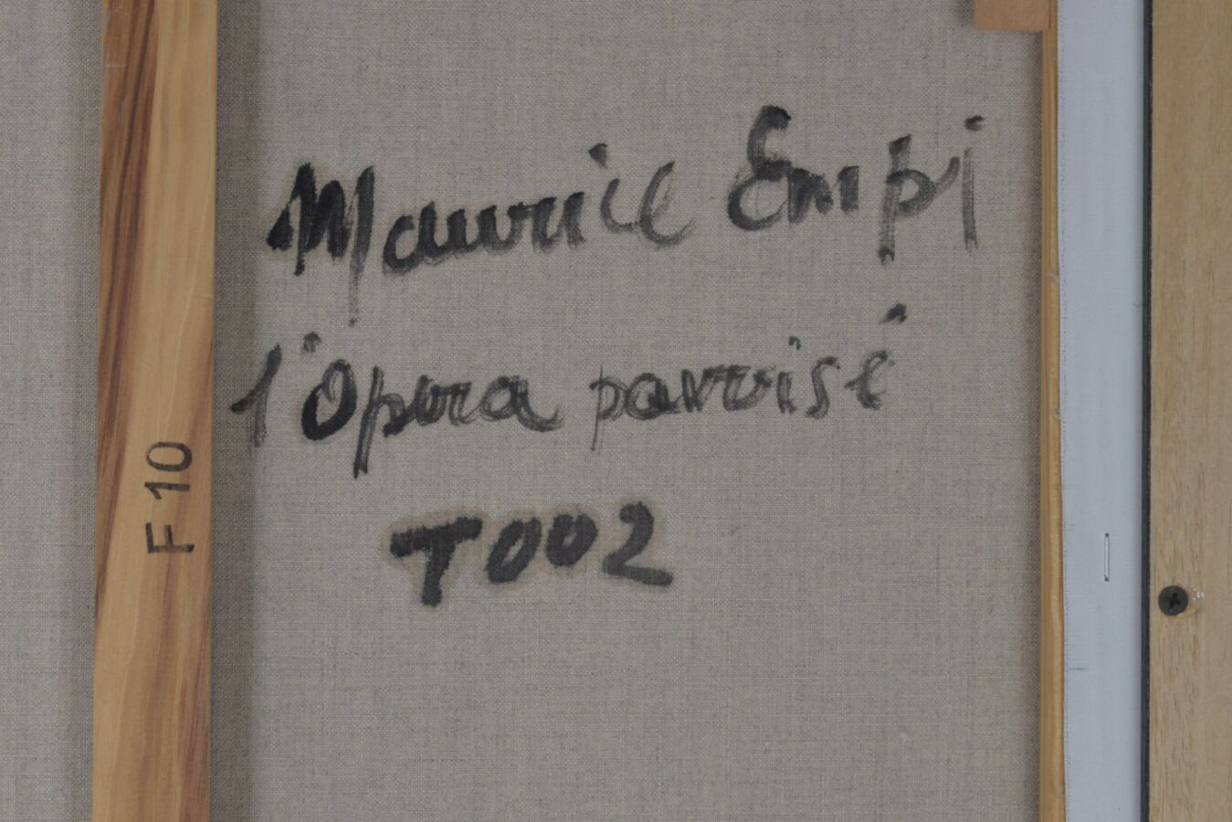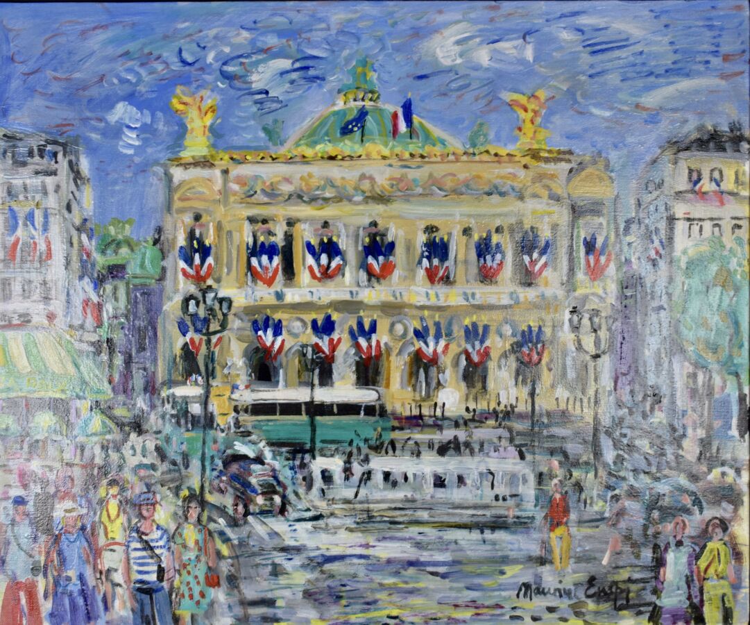 Maurice EMPI (1933), "L'opéra Pavoisée", 2016 , huile sur toile, signée en bas à droite, contresignée et titrée au dos, 46,5 x 54 cm.