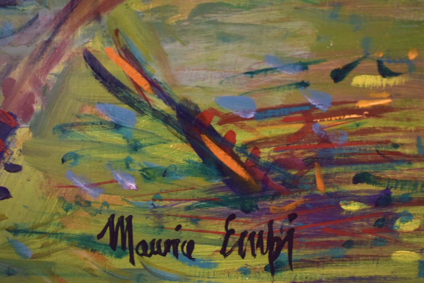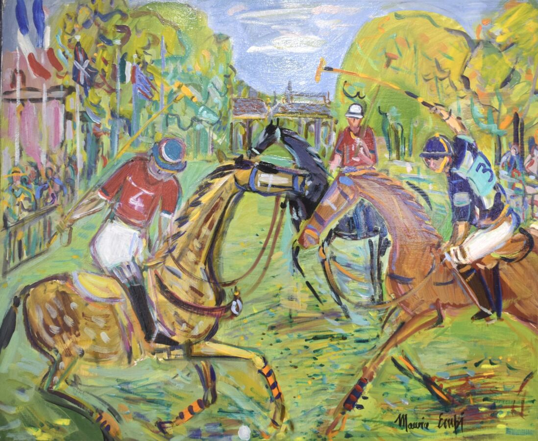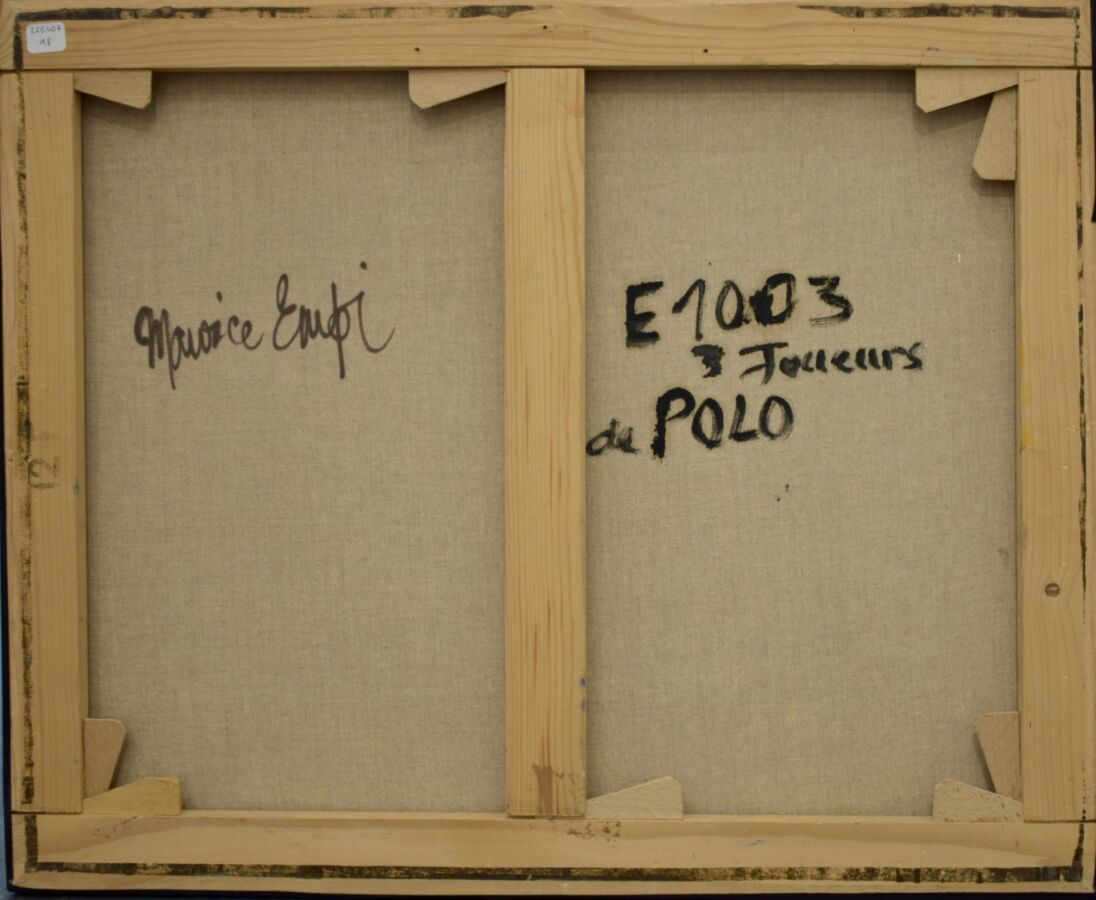Maurice EMPI (1933), "Trois joueurs de polo", huile sur toile, signée en bas à droite, contresignée et titrée au dos, 61 x 50 cm.
