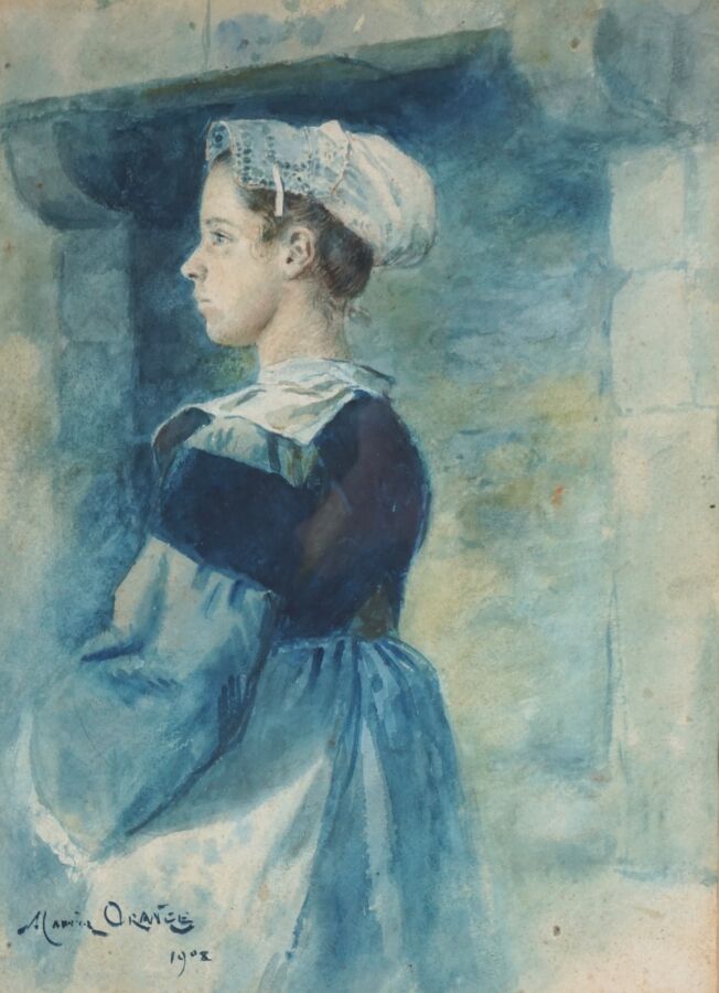 Maurice Henri ORANGE (1868-1916), "Bretonne à la coiffre" 1908, aquarelle sur papier signée en bas à gauche, 36.5 x 26 cm (à vue).