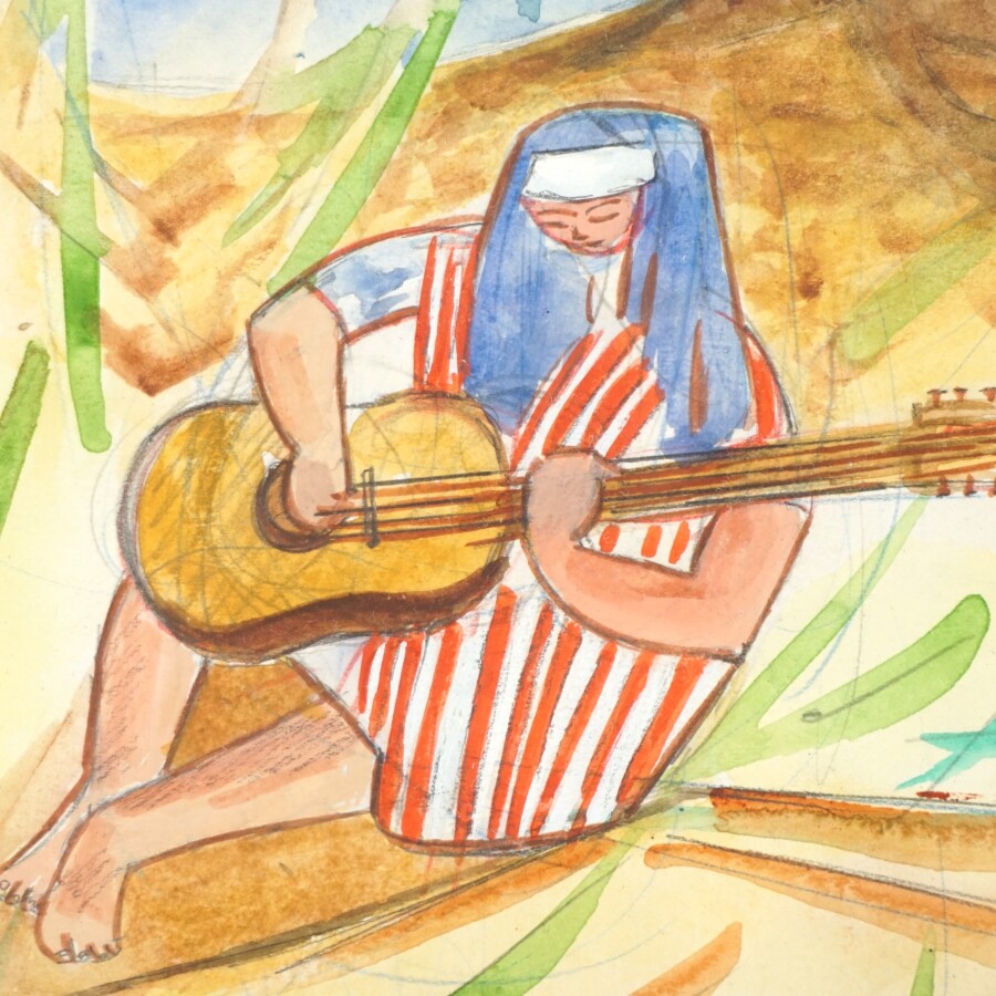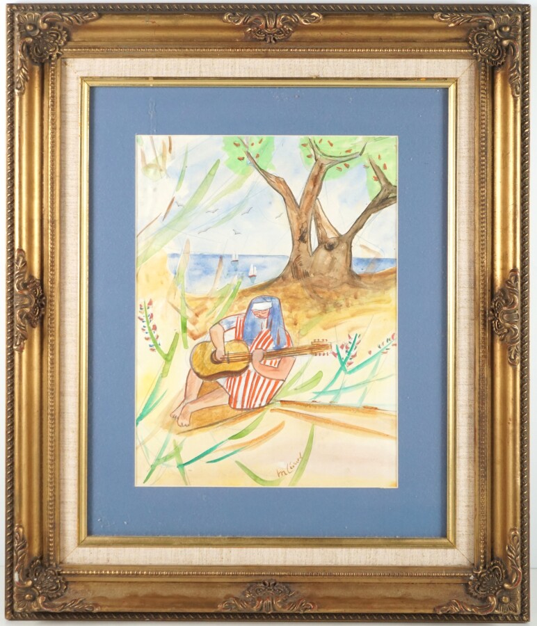 Maurice LÉONARD (1899-1971), "La guitariste", aquarelle sur papier, signée en bas au centre, porte le cachet de l'atelier de l'artiste au dos, 31 x 23 cm (à vue).