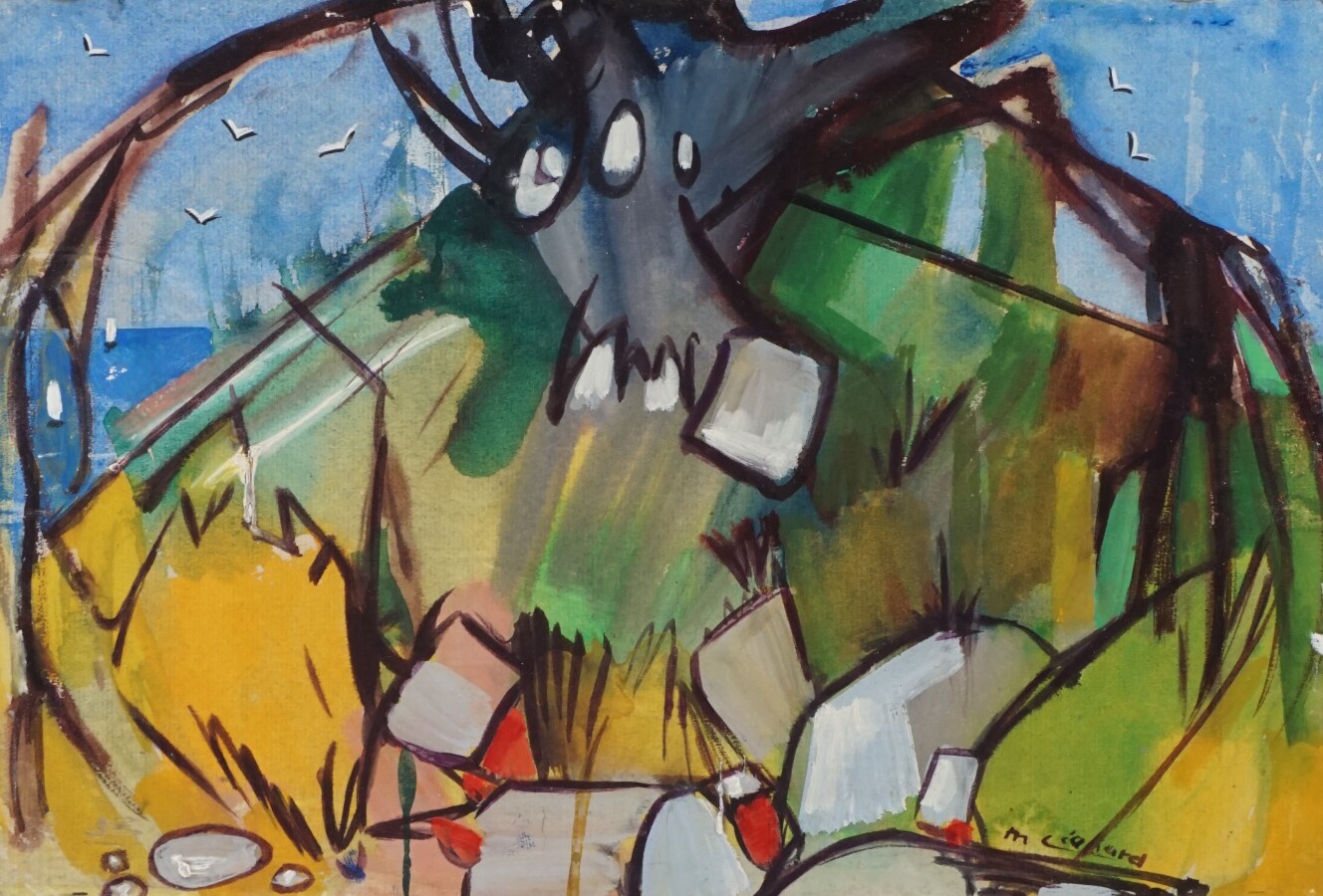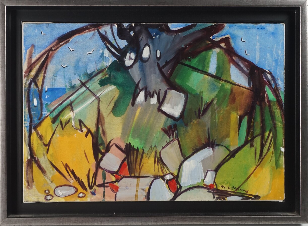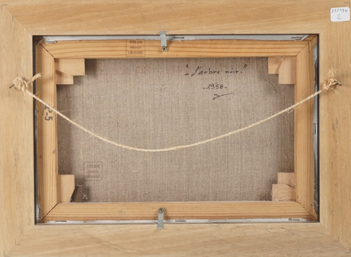 Maurice LEONARD (1914), "L'arbre noir", reproduction rehaussée, marouflée sur carton et placée sur toile, signée dans la planche en bas à droite, titrée au dos, cachet "Atelier Maurice Leonard", 23.5 x 35 cm.