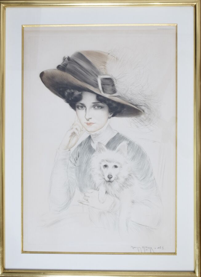 Maurice MILLIERE (1871-1946), "Femme au chapeau et au petit chien", aquarelle et rehaut de pastel, signée en bas à droite, 61 x 45.5 cm.
