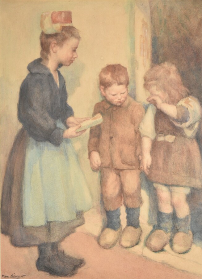 Max CLÉMENT (1912-1995), "Jeunes enfants à la leçon", pastel et aquarelle signé en bas à gauche, 69 x 51 cm.