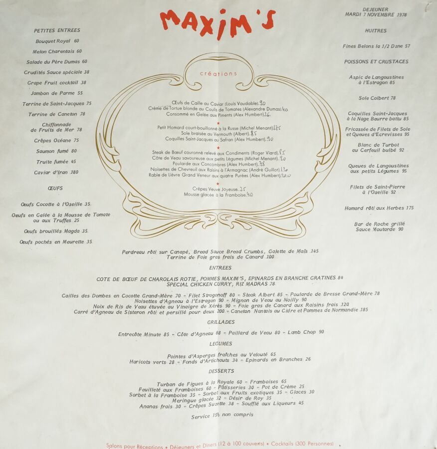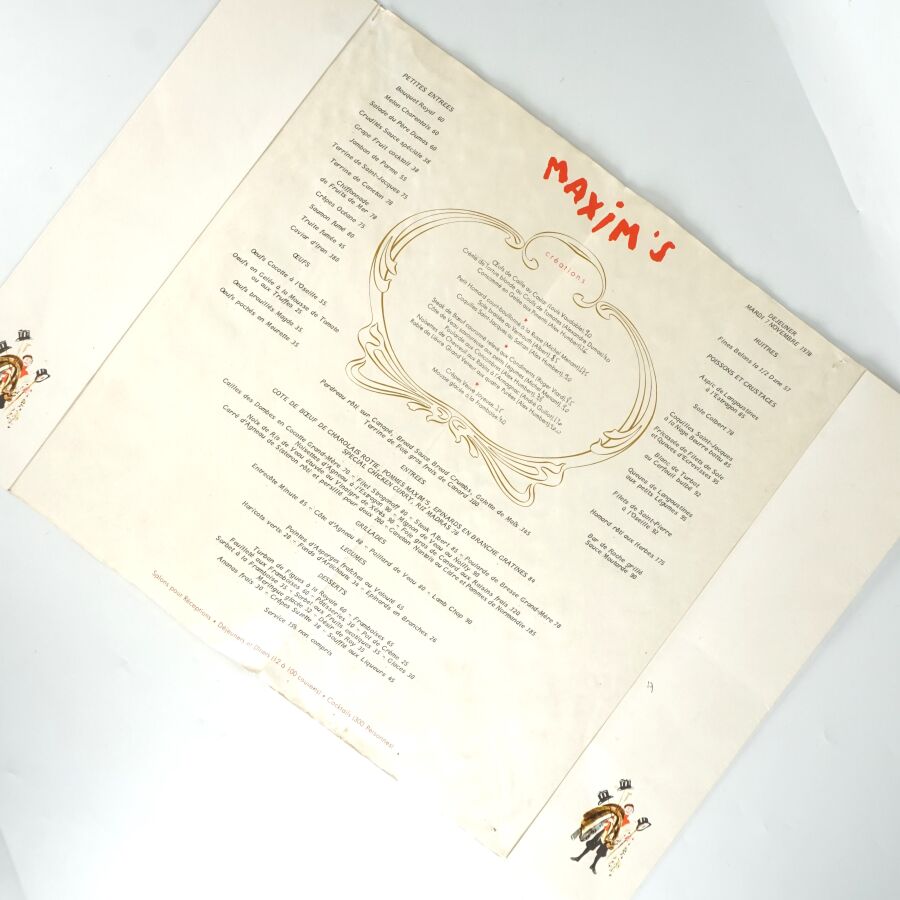 MAXIM'S : Menu en deux feuillets, illustré par SEM, daté de 1958 (petites usures aux coins).