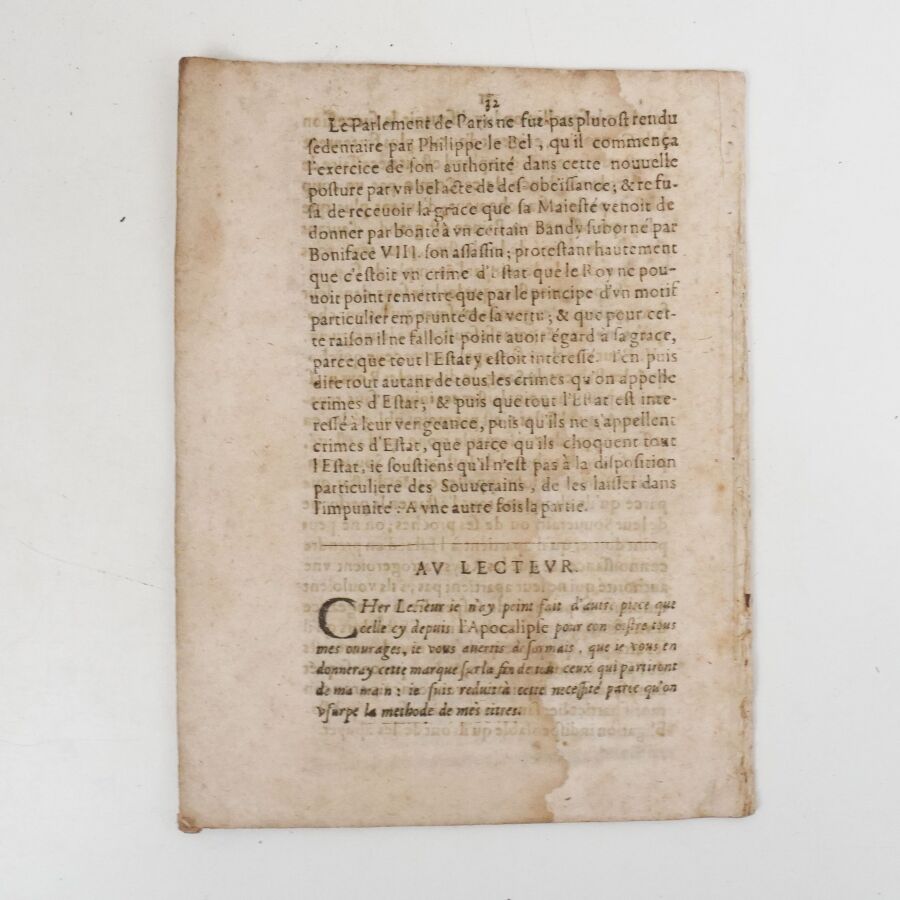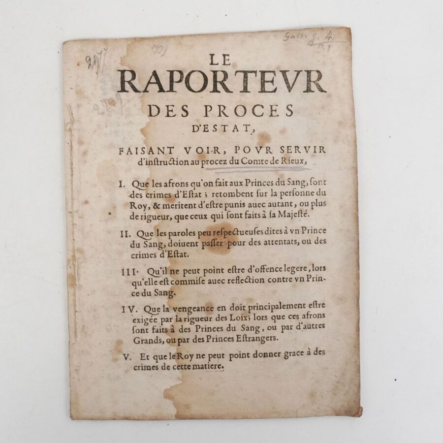 [Mazarinade - DU BOSC DE MONTANDRÉ (Claude)]. Le Raporteur [sic] des proces d'Estat, faisant voir, pour servir d'instruction au procez du Comte de Rieux. s. l., s. n., [1652]. In-8 broché de 32 pp. sous chemise cartonnée.