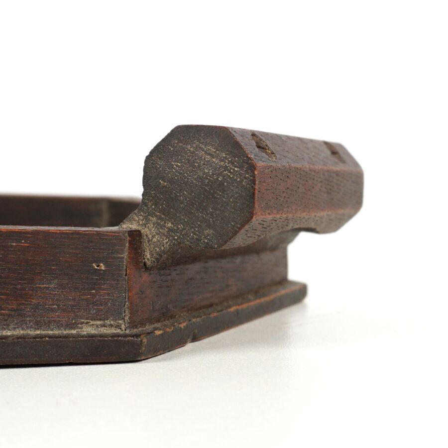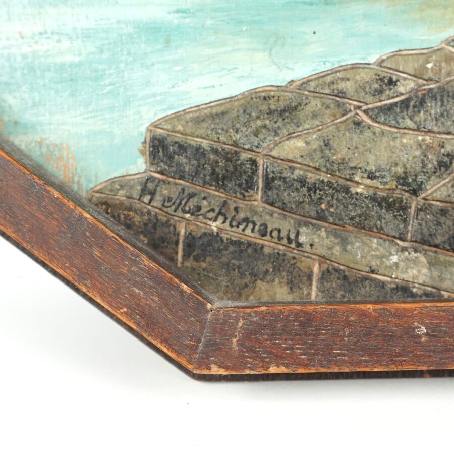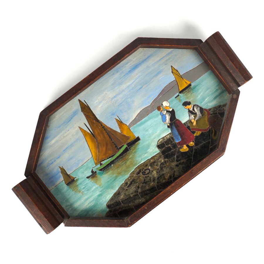 MECHINEAU (XXe), plateau en bois peint à motif d'un départ pour la pêche, signé en bas à gauche, L. Totale : 46 cm.