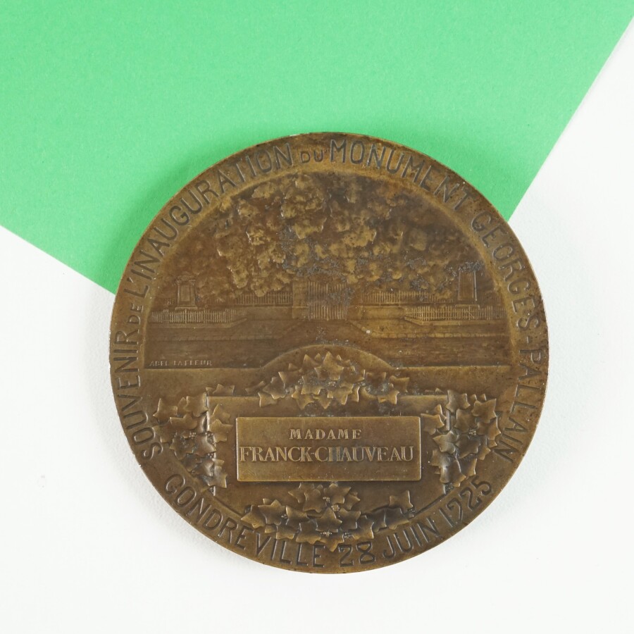 Médaille, bronze, Gallia Victrix, signée Abel Lafleur, au revers, "Souvenir de l'inauguration du Monument Georges Pallain, Gondreville 28 juin 1925", tranche lisse, Diam : 7.7 cm. Poids brut : 197.6 g environ (quelques usures).