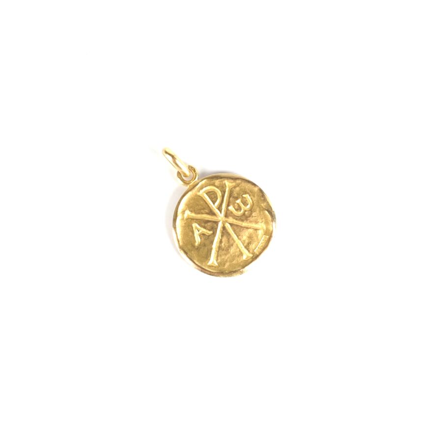 Médaille "Chrisme" en or jaune 18K (750/oo), signée Becker, Diam. 1.8 cm. Poids brut : 3.2 g environ.
