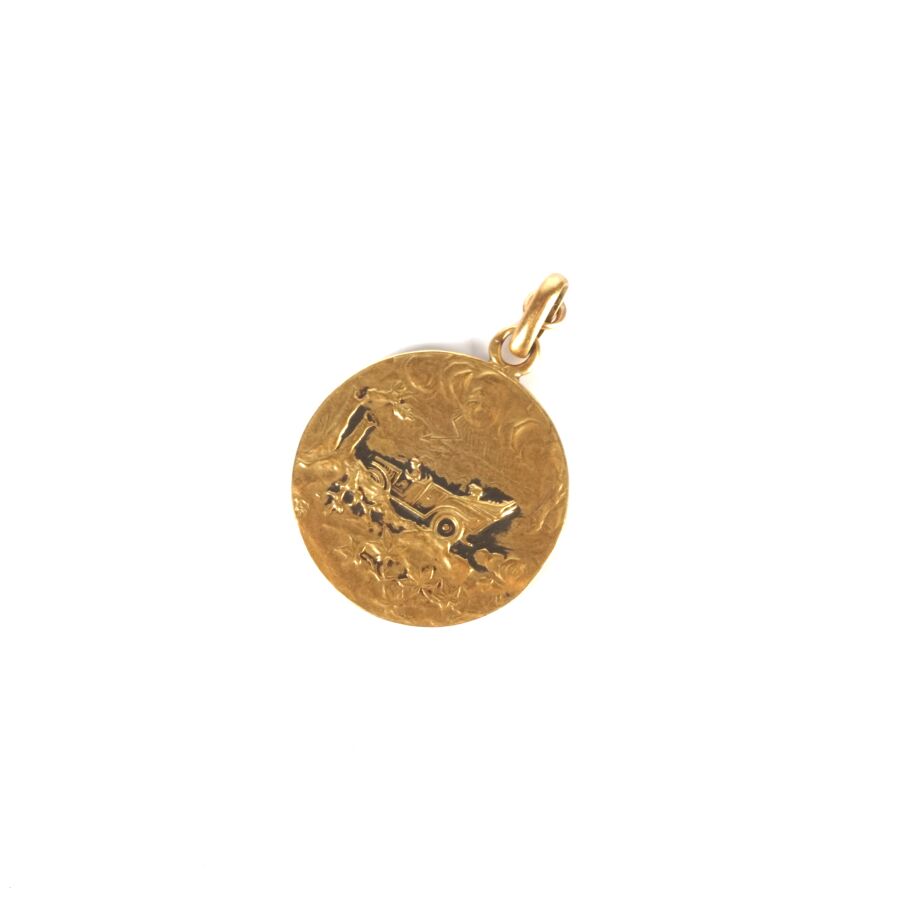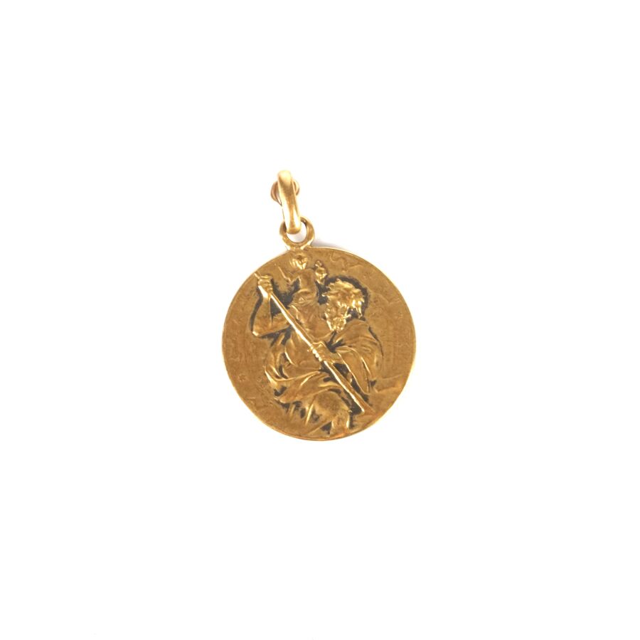 Médaille en or jaune 18K (750/oo) à motif d'un saint et du Christ, Diam. 2.3 cm. Poids brut : 7.8 g environ.