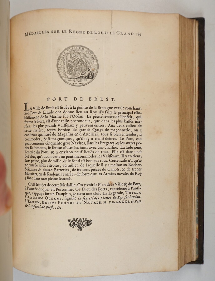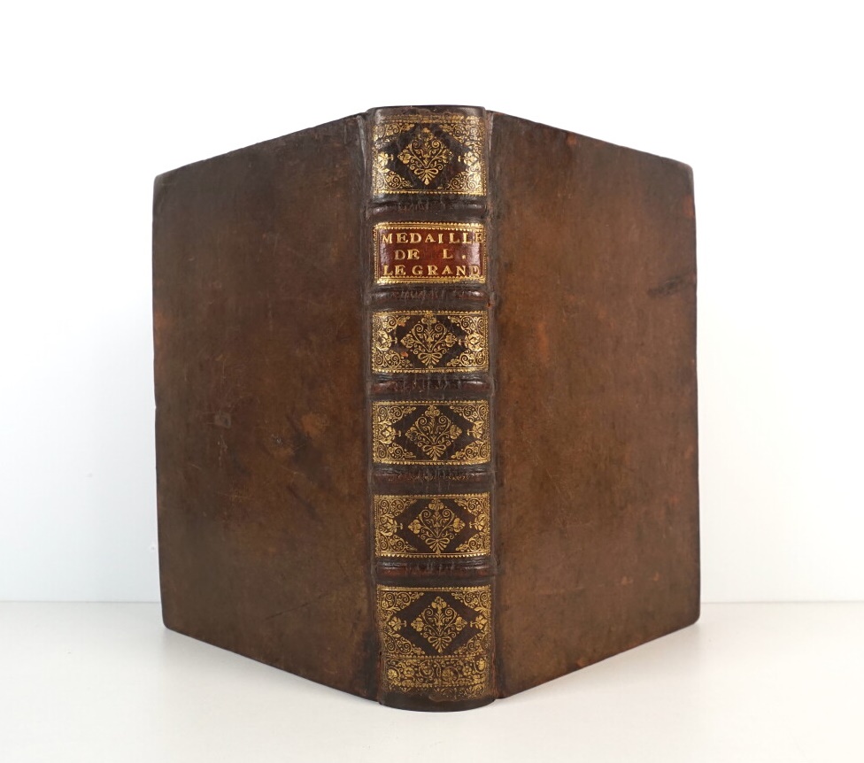 Médailles sur les principaux événements du règne de Louis le Grand, avec des explications historiques, par l'Académie royale des médailles et des inscriptions - Paris ; Imprimerie Royale, 1702 - 1 volume grand In-4° - 1 frontispice allégorique d'après Ant. Coypel, vignette armorié au titre par Le Clerc, et nombreuses gravées médailles in texte - Reliure de l'époque veau brun habillement restaurée aux mors, coins et coupes (2 épidermures au 1er plat) - Dos à nerfs orné (coiffes restaurées) - Pièce de titre maroquin bordeaux (probablement refaite) - Tranches mouchetées de rouge - Bon exemplaire en édition originale de l'impression In-4°.