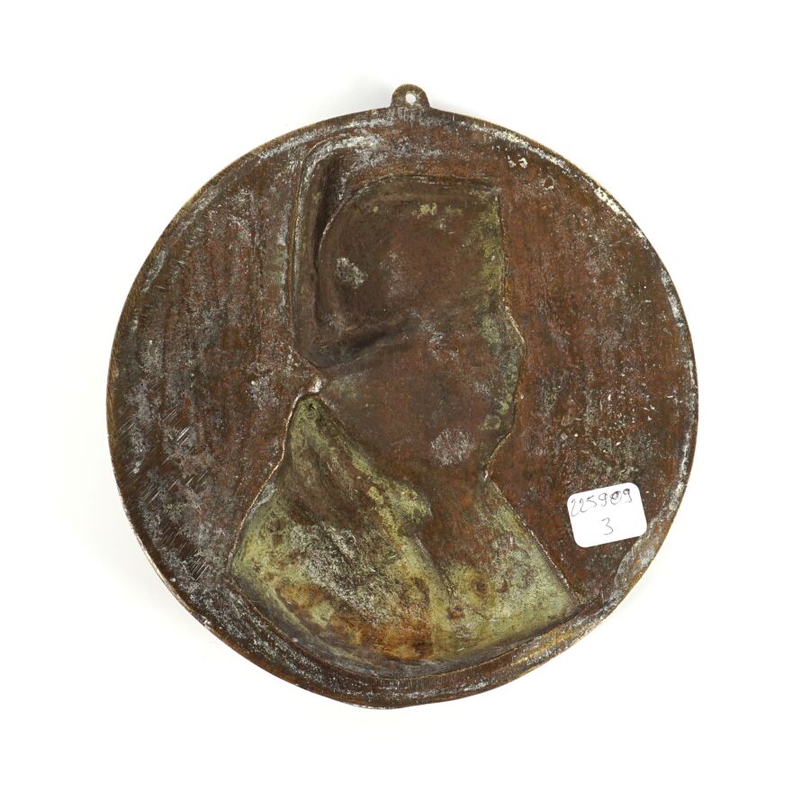 Médaillon uniface en laiton doré à décor du profil de Napoléon 1er (1769-1821), D. 18 cm.
