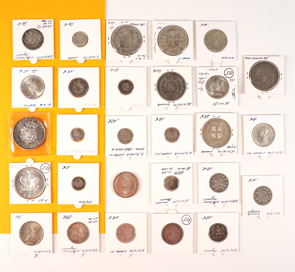 MEDITERRANEE : Ensemble de 28 monnaies en argent, comprenant : 12 x Italie, 2 x Sicile, 1 x Parme, 3 x Milan, 3 x Malte, 5 x Vatican et 2 x Sardaigne (dont Charles Felix 1829).