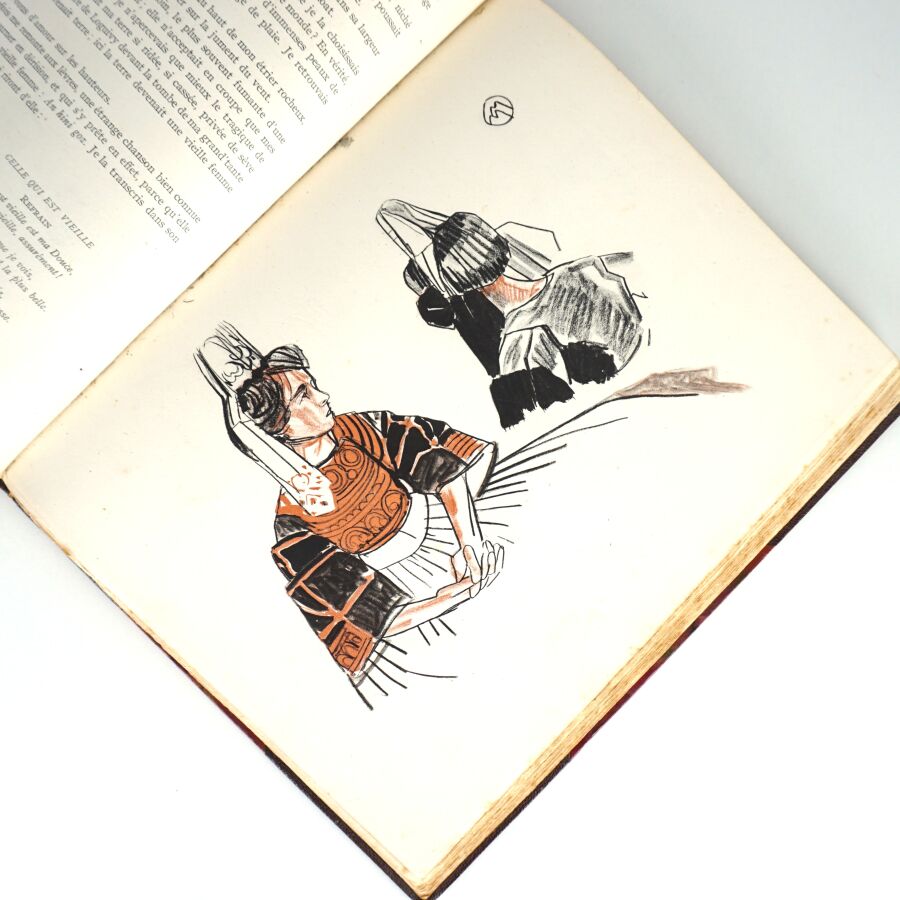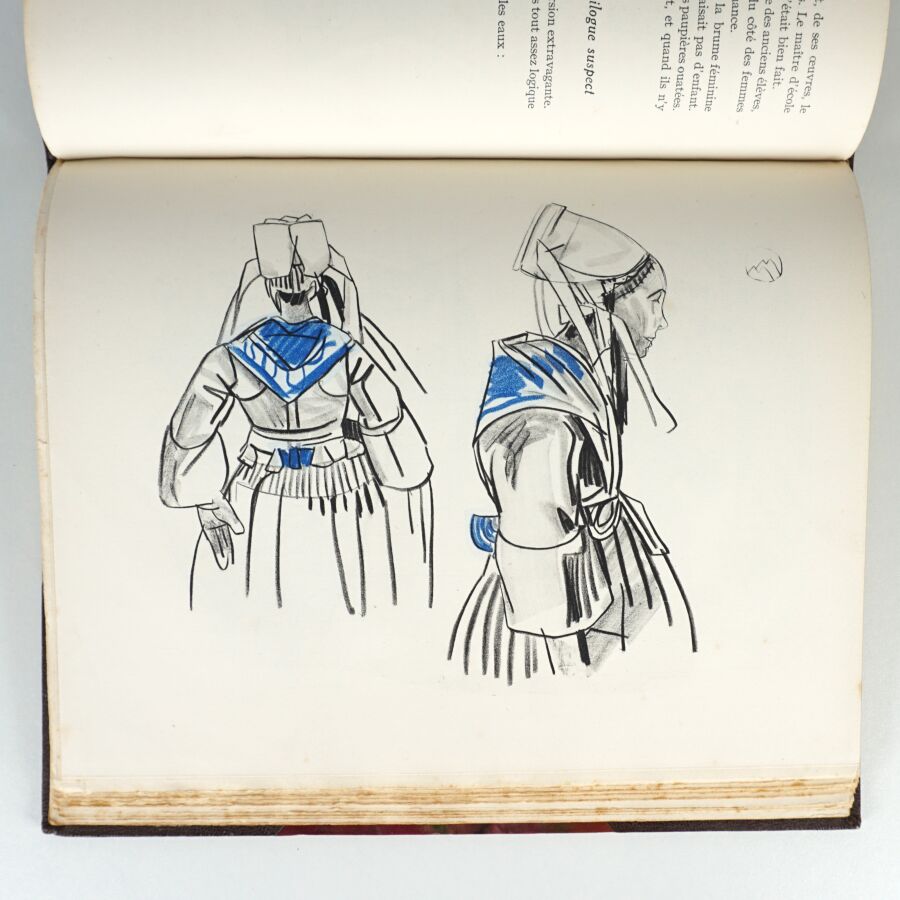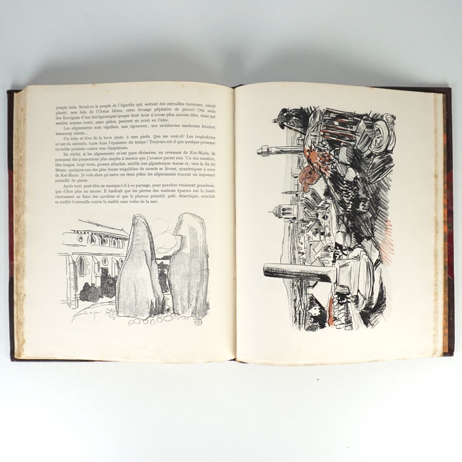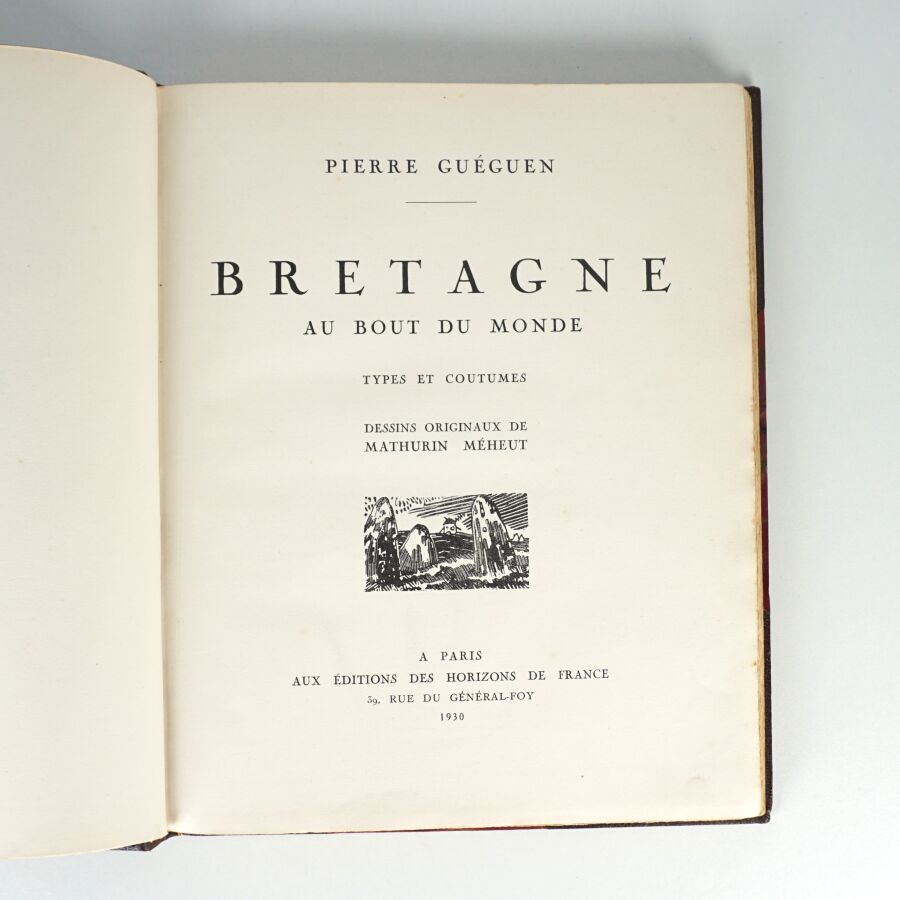 MÉHEUT (Mathurin) & GUÉGUEN (Pierre). Bretagne au bout du monde. Types et coutumes. Paris, Horizons de France, 1930. In-4 demi-chagrin brun à coins, dos à nerfs, titre doré, tête dorée, couv. ill. d'après Méheut et dos conservés. Nombreuses illustrations en couleurs et en noir dans et hors texte de M. Méheut. Petites rousseurs éparses.