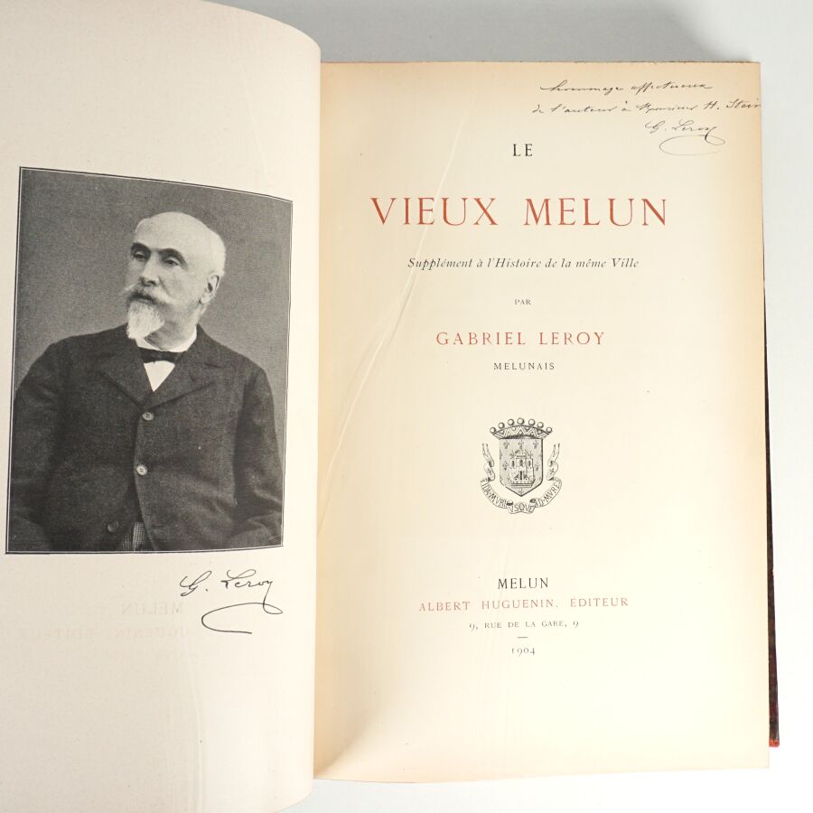 - LEROY (Gabriel), Le Vieux Melun, supplément à l'Histoire de la même ville. Melun, Huguenin, 1904. In-8 demi-chagrin rouge, dos à nerfs, titre doré (reliure de l'époque). Qqs frottés. Portrait en frontispice et illustrations à pleine page. E.A.S. de l'auteur au titre.