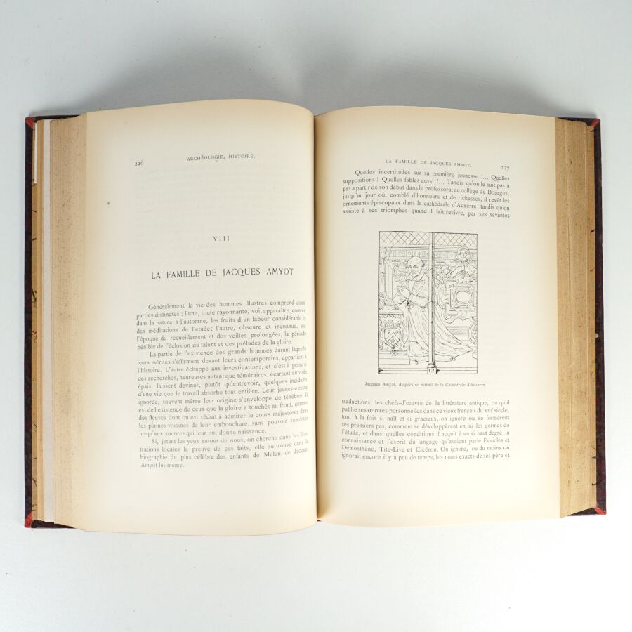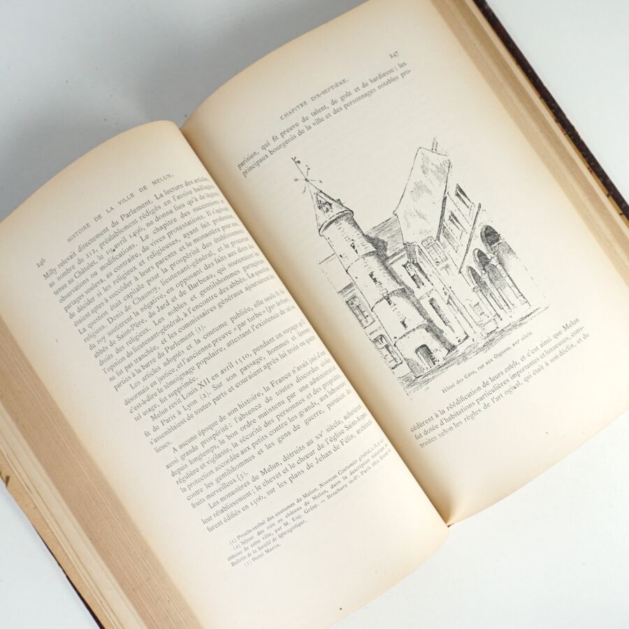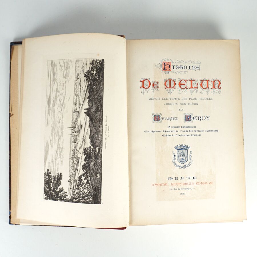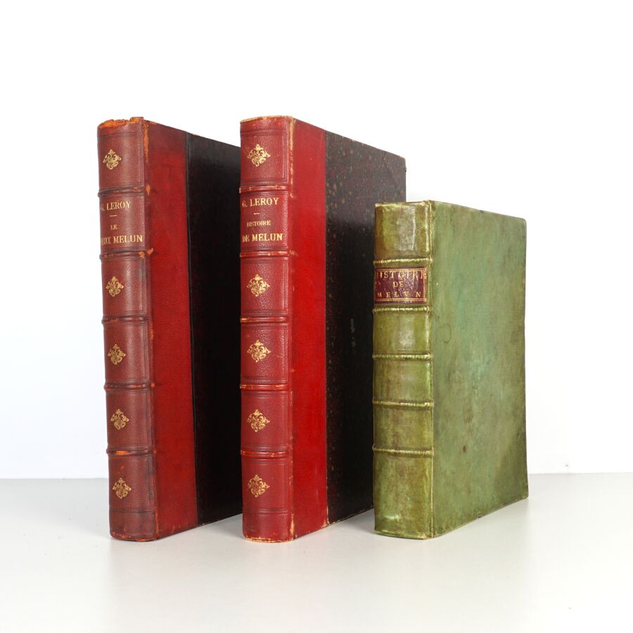 - LEROY (Gabriel), Histoire de Melun depuis les temps les plus reculés jusqu'à nos jours. Melun, Drosne, 1887. In-8 demi-chagrin rouge, dos à nerfs, titre doré (reliure de l'époque). Qqs frottés, garde et faux-titre en partie détachés. Illustrations à pleine page.