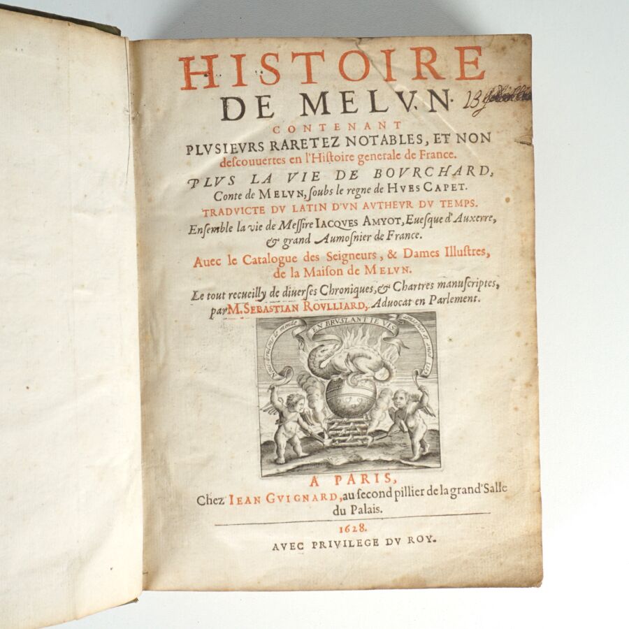 Melun - ROUILLARD (Sébastien). Histoire de la ville de Melun contenant plusieurs raretés, non découvertes en l'histoire génerale de France. Plus la vie de Bourchard, Comte de Melun, soubs le regne de Hues Capet. Avec le catalogue de plusieurs Seigneurs, & Dames illustres, de la maison de Melun. Paris, Guignard, 1628. In-4, vélin vert, dos à nerfs, p. de titre en mar. rouge (reliure de l'époque).