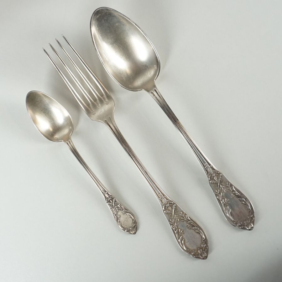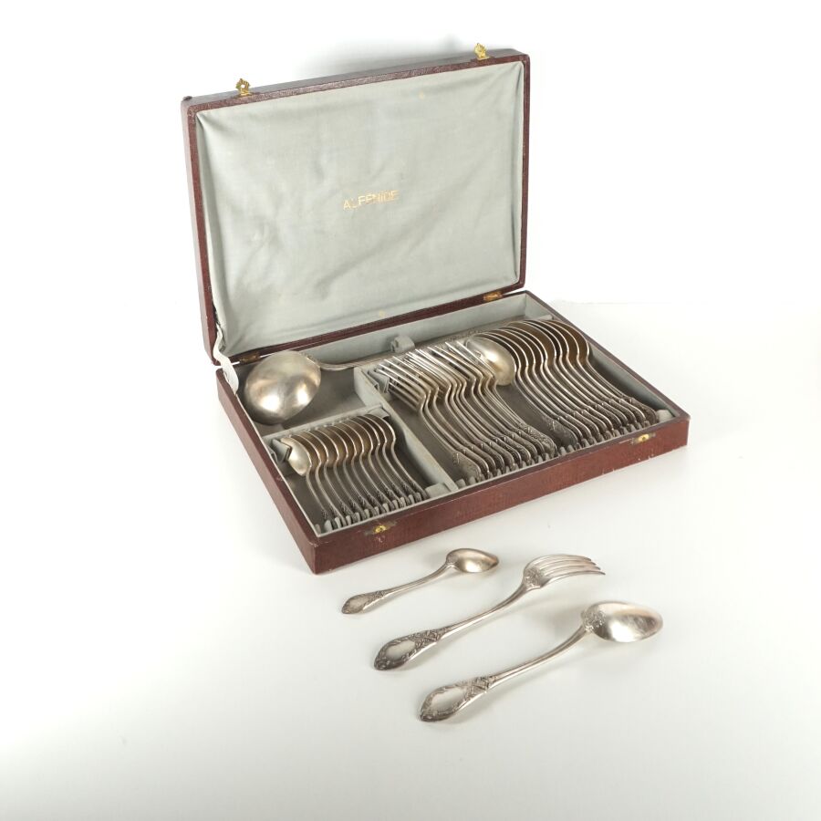 Ménagère en métal argenté à décor feuillagé et au filet comprenant douze couverts, douze petites cuillères et une louche, présentée en coffret (quelques traces).