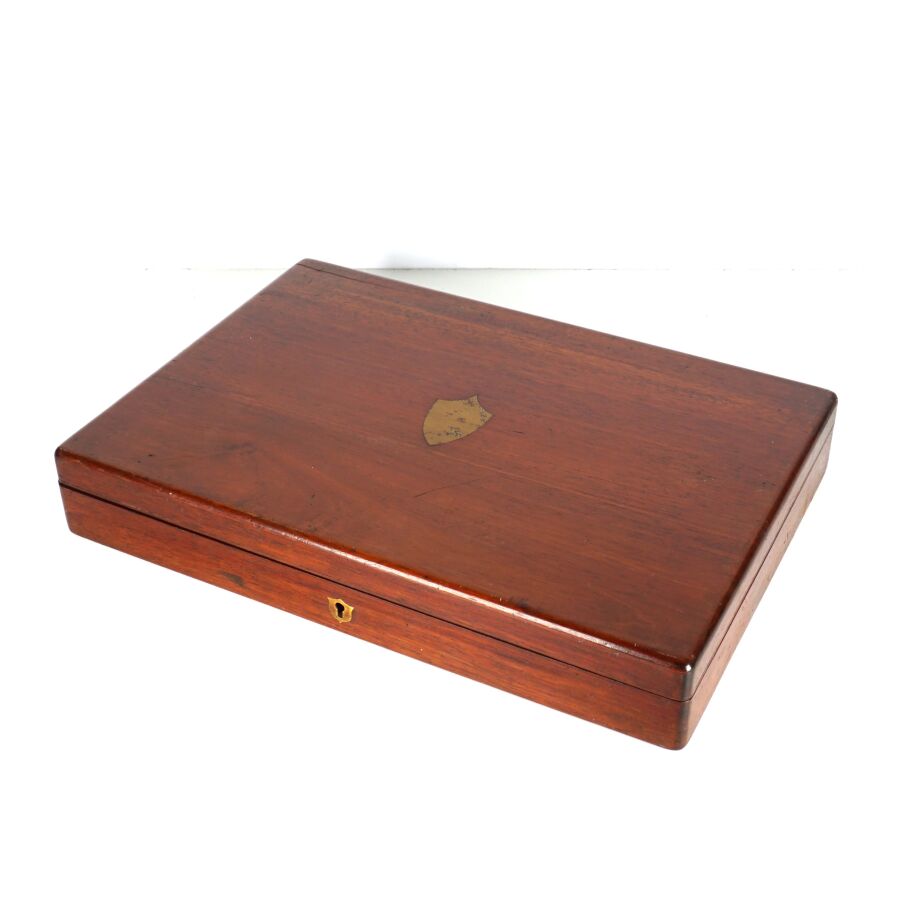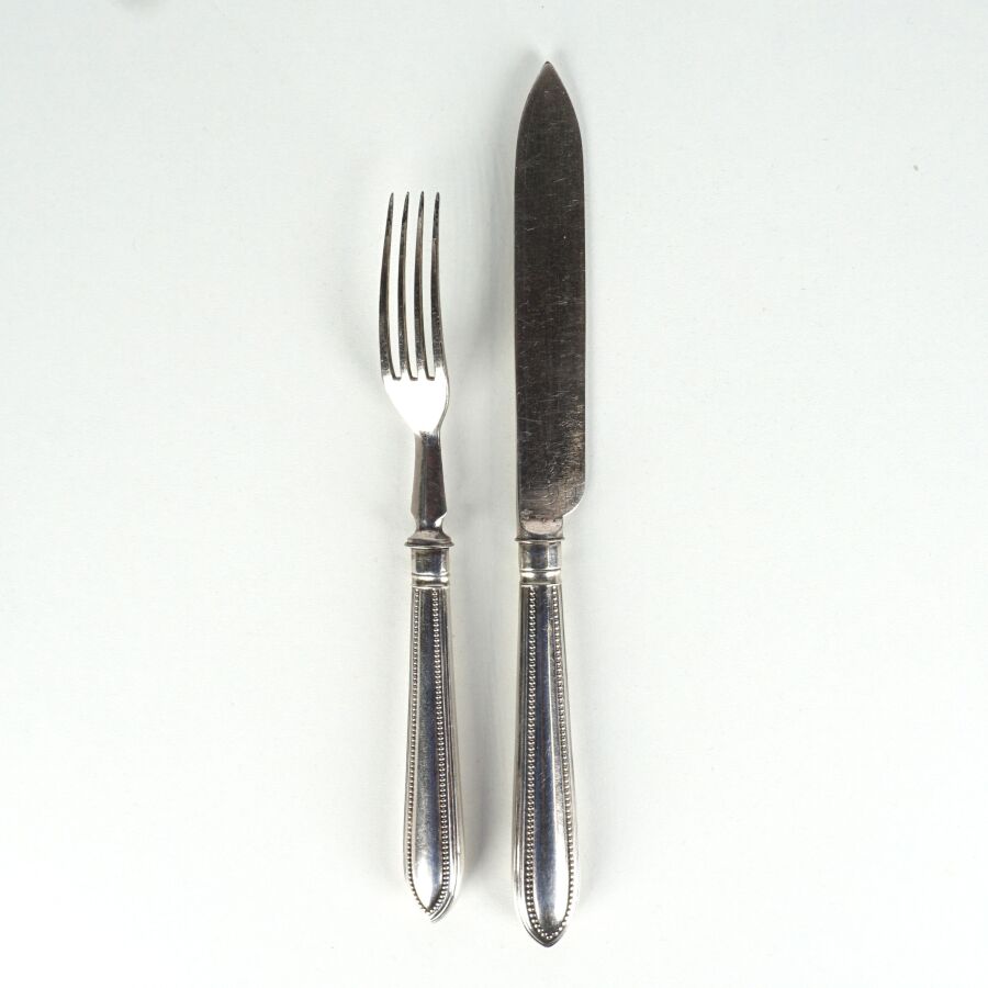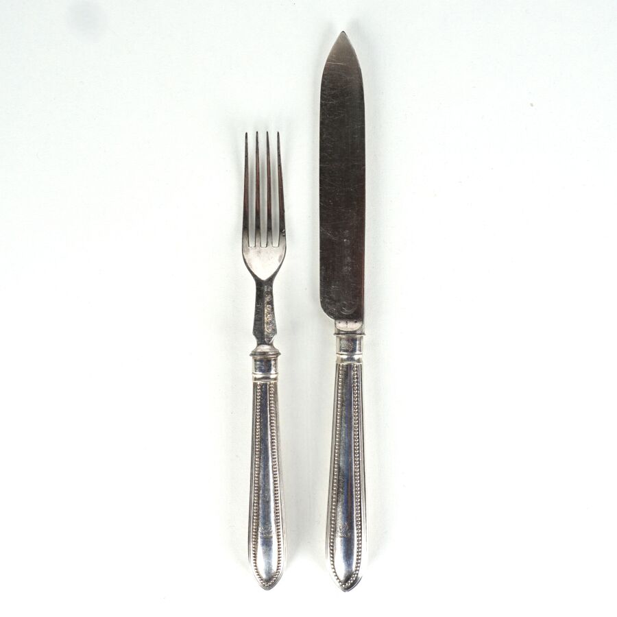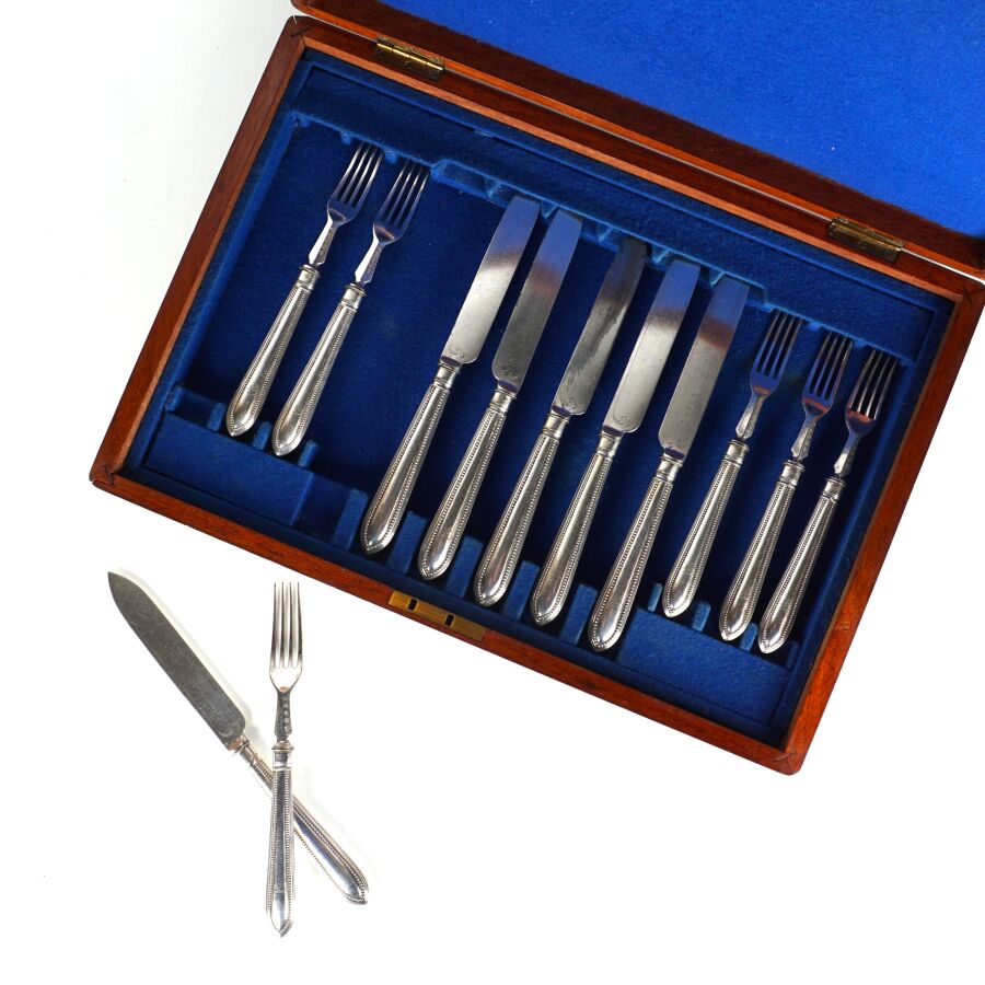 Ménagère en métal argenté, le manche à décor de frise perlée et de lion couronné comprenant 6 fourchettes et 6 couteaux, présentée dans son coffret en bois d'origine, L. Fourchette : 18.5 cm.