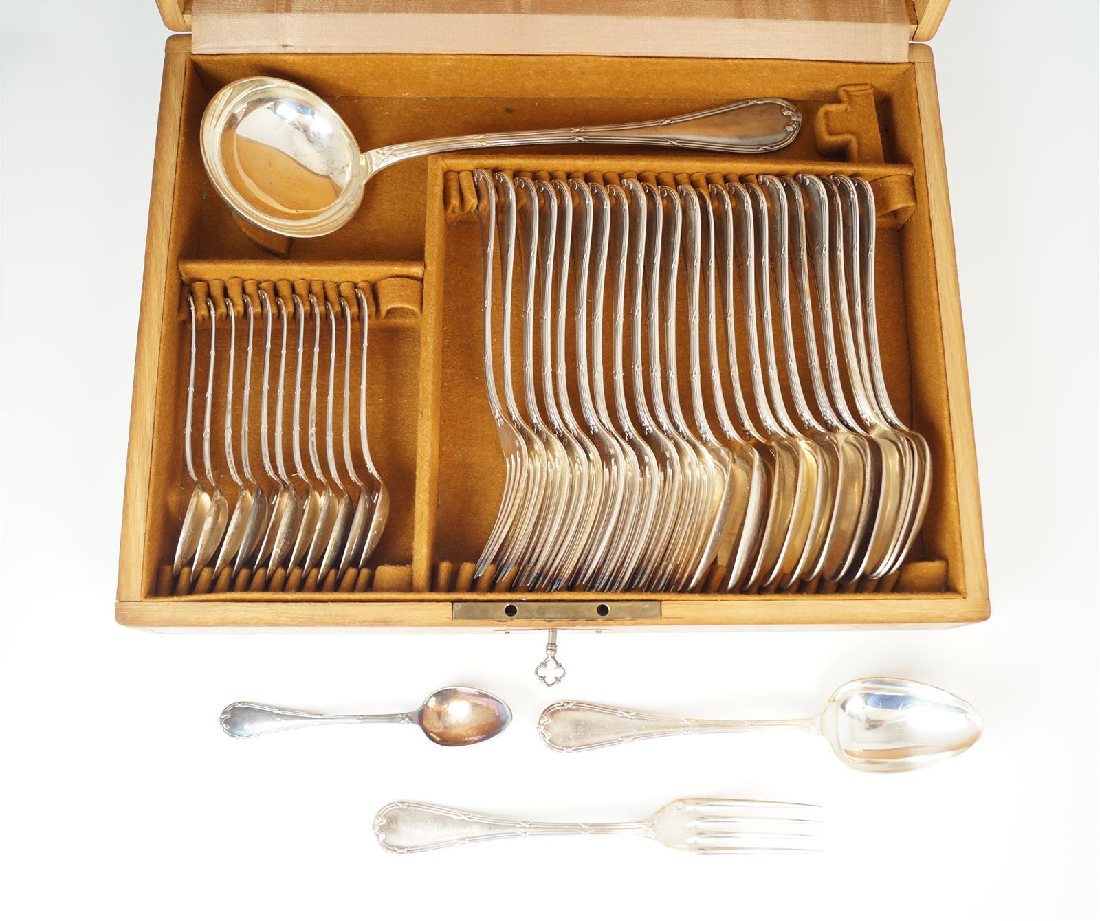 Ménagère en métal argenté, modèle filets et rubans, comprenant : 12 grands couverts, 1 louche, et 12 petites cuillères (dans un coffret rapporté)