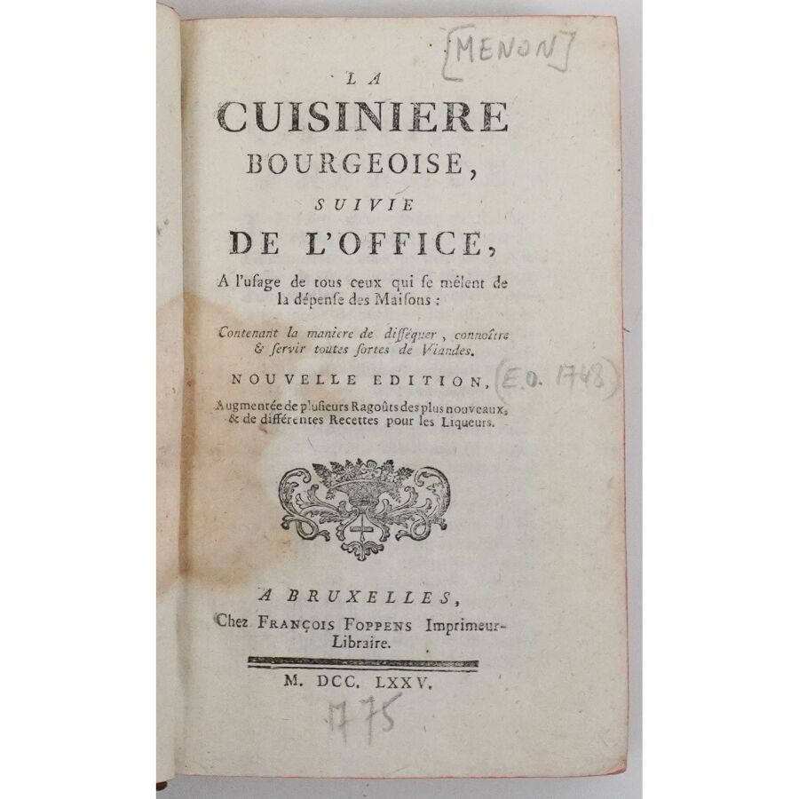 [MENON (Joseph)]. La Cuisinière bourgeoise, suivie de l'office, à l'usage de tous ceux qui se mêlent de la dépense des maisons ; contenant la manière de disséquer, connoître & servir toutes sortes de viandes. Nouvelle édition, augmentée de plusieurs ragoûts des plus nouveaux & de différentes recettes pour les liqueurs. Bruxelles, Foppens, 1775. In-12, veau marbré, dos lisse orné, tranches rouges (reliure de l'époque). Tache d'humidité au premier plat se retrouvant sur les 150 premières pages environ sinon bon exemplaire. Ex-libris Jean Guégau.