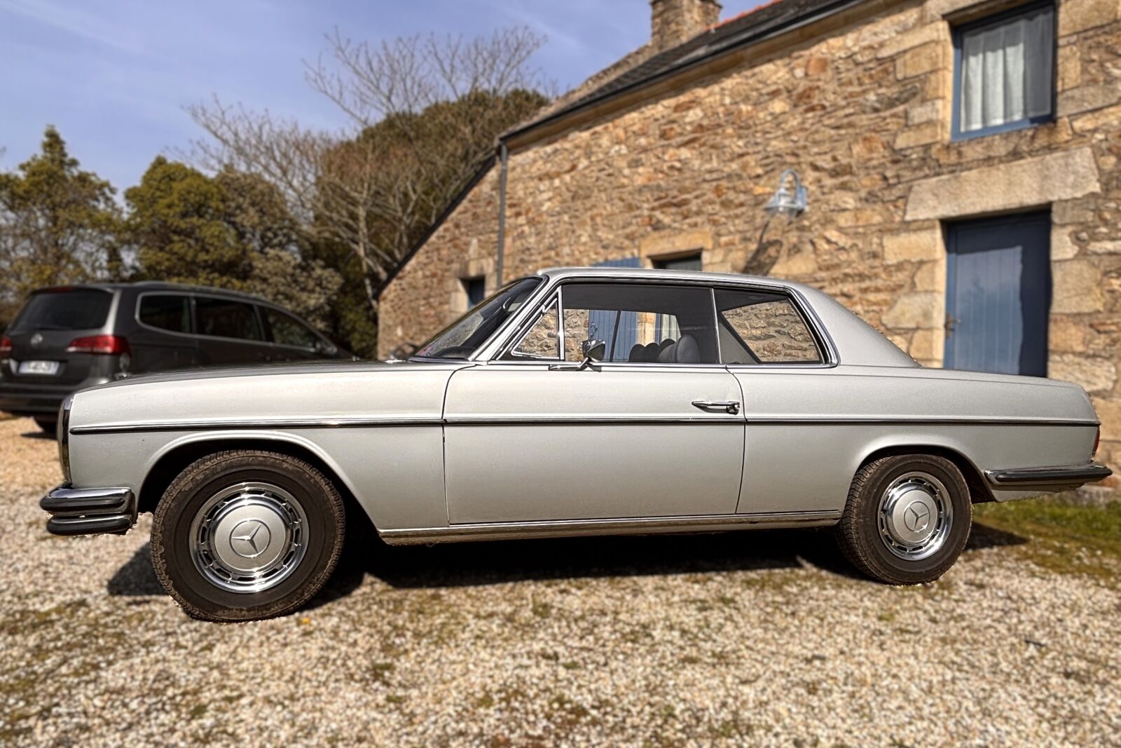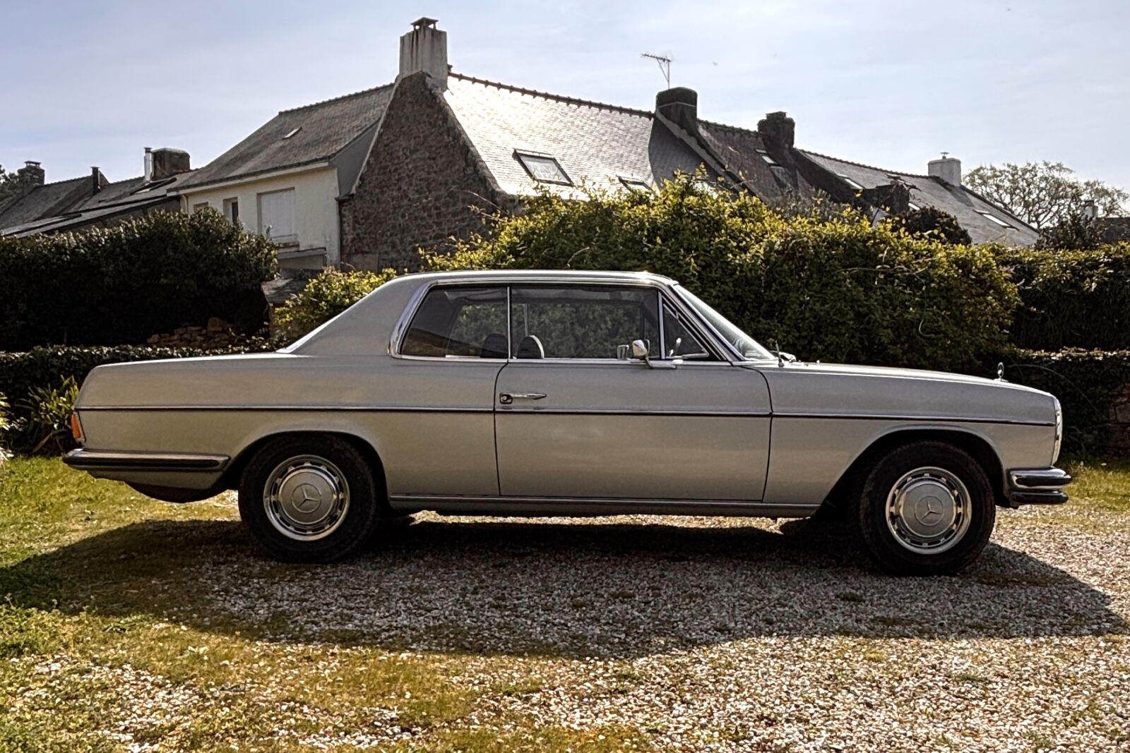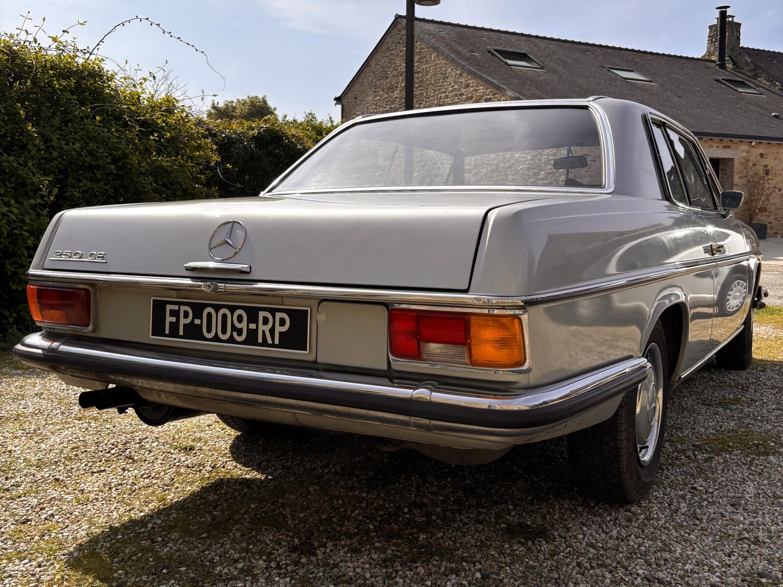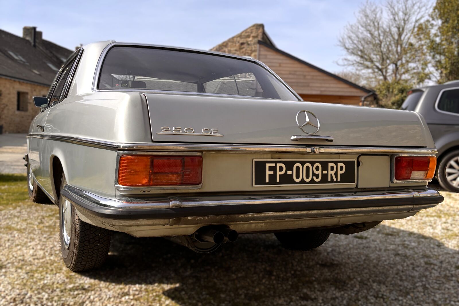 MERCEDES 250 CE type W114 du 13/04/ 1971, Coupé 2 portes 5places, Carte grise française de Collection, contrôle technique favorable Autovision en date du 27/03/2026, n° de série : 11402210015620, 23793 km au compteur, 2° main le propriétaire actuel l'a acquise en 2020 et a depuis effectué les travaux suivants : nettoyage du réservoir, vidanges, remplacement des durits, 4 pneus neufs, ligne complète d'échappement, pompe à essence, jauge, divers silent-blocs, ligne d'injection, 6 injecteurs neufs, biellettes de direction ainsi que le parallélisme. Tableau de bord façon bois bien complet de ses instruments avec autoradio. Moteur 6 cylindres en ligne 2L5 en bon état de marche, 14 CV fiscaux, boite manuelle 5 vitesses. Peinture d'origine gris métallisé. Sellerie velours et simili bleu 2 tons en très bon état de conservation.
