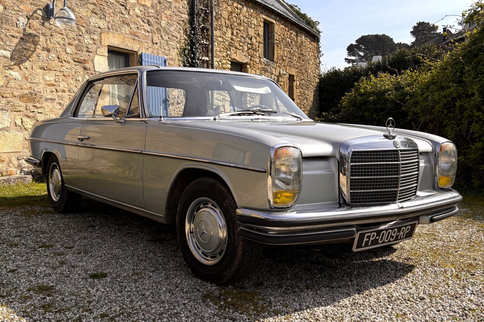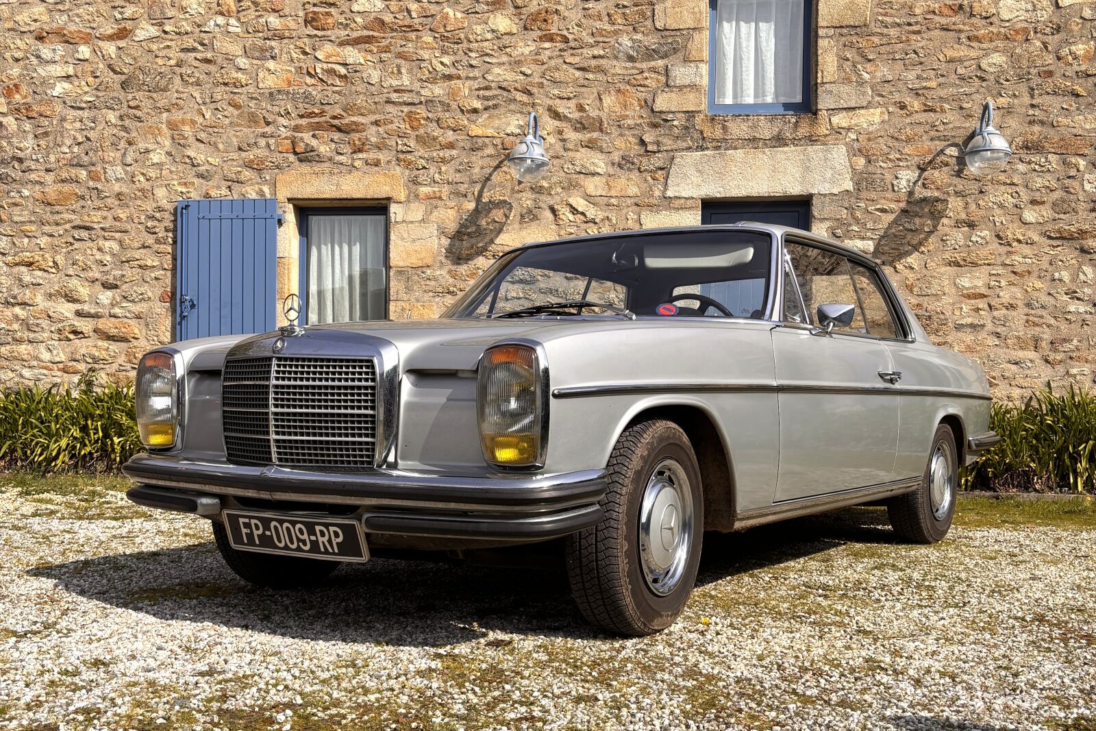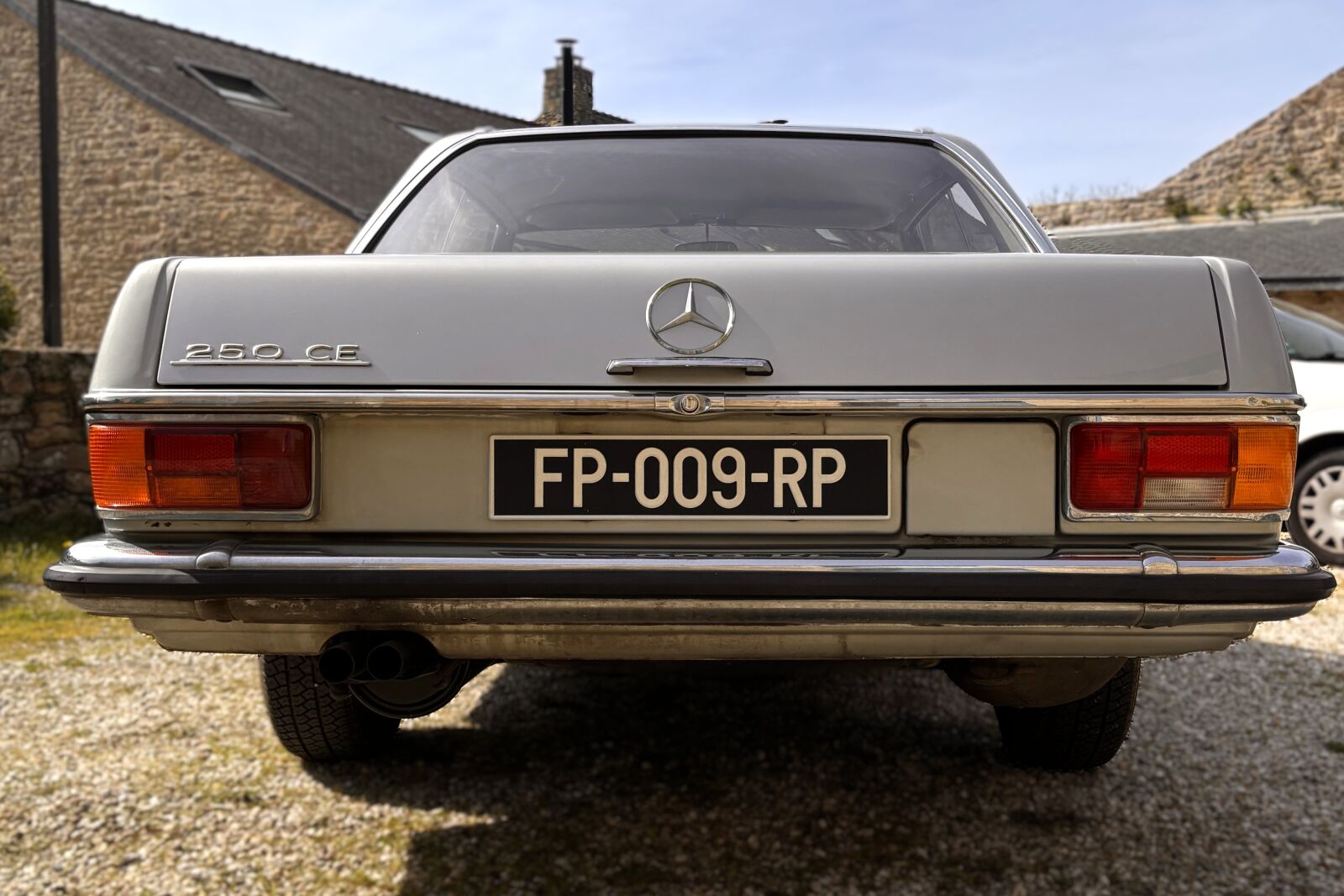 MERCEDES 250 CE type W114 du 13/04/ 1971, Coupé 2 portes 5places, Carte grise française de Collection, contrôle technique favorable Autovision en date du 27/03/2026, n° de série : 11402210015620, 23793 km au compteur, 2° main le propriétaire actuel l'a acquise en 2020 et a depuis effectué les travaux suivants : nettoyage du réservoir, vidanges, remplacement des durits, 4 pneus neufs, ligne complète d'échappement, pompe à essence, jauge, divers silent-blocs, ligne d'injection, 6 injecteurs neufs, biellettes de direction ainsi que le parallélisme. Tableau de bord façon bois bien complet de ses instruments avec autoradio. Moteur 6 cylindres en ligne 2L5 en bon état de marche, 14 CV fiscaux, boite manuelle 5 vitesses. Peinture d'origine gris métallisé. Sellerie velours et simili bleu 2 tons en très bon état de conservation.